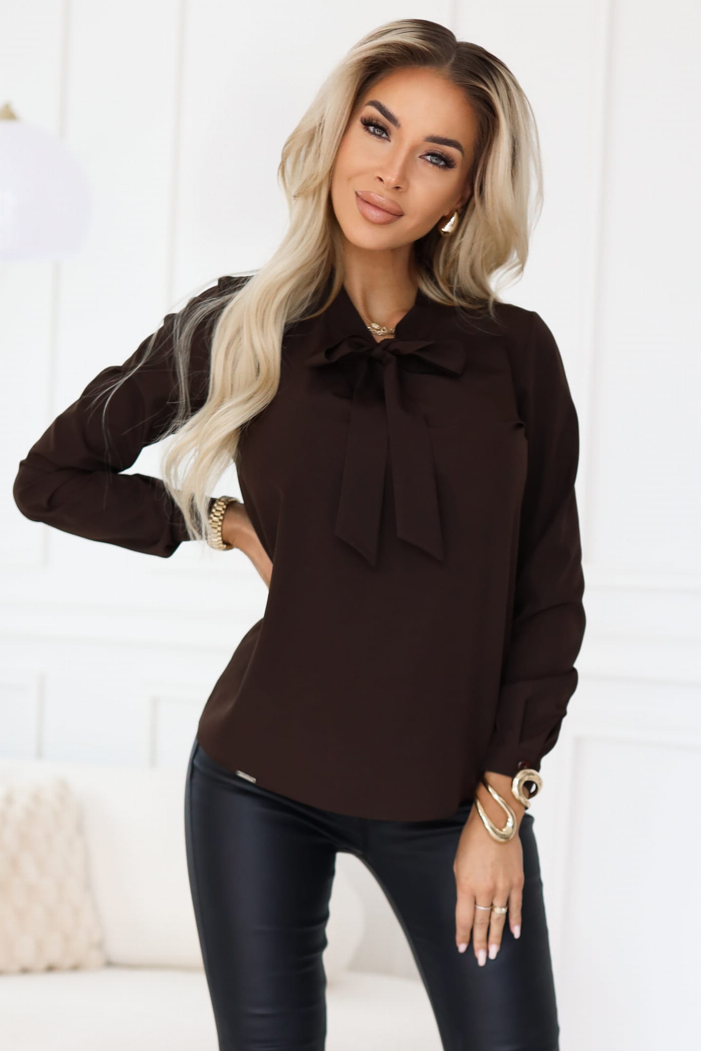 140-29 Biznesowa bluzka z długim rękawkiem i wiązaniem z przodu - czekoladowa