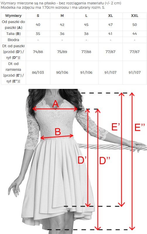 | Dł. od pachy [przód (D') / tył (D'')] | 74/88 | 75/88 | 77/88 | 77/88 | 77/88 | 78/88 | 78/88 |