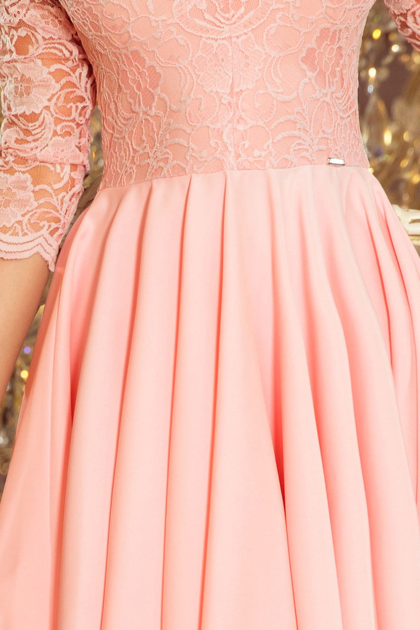 210-7 Rozkloszowana sukienka z dłuższym tyłem i koronkowym dekoltem - PASTELOWY RÓŻ