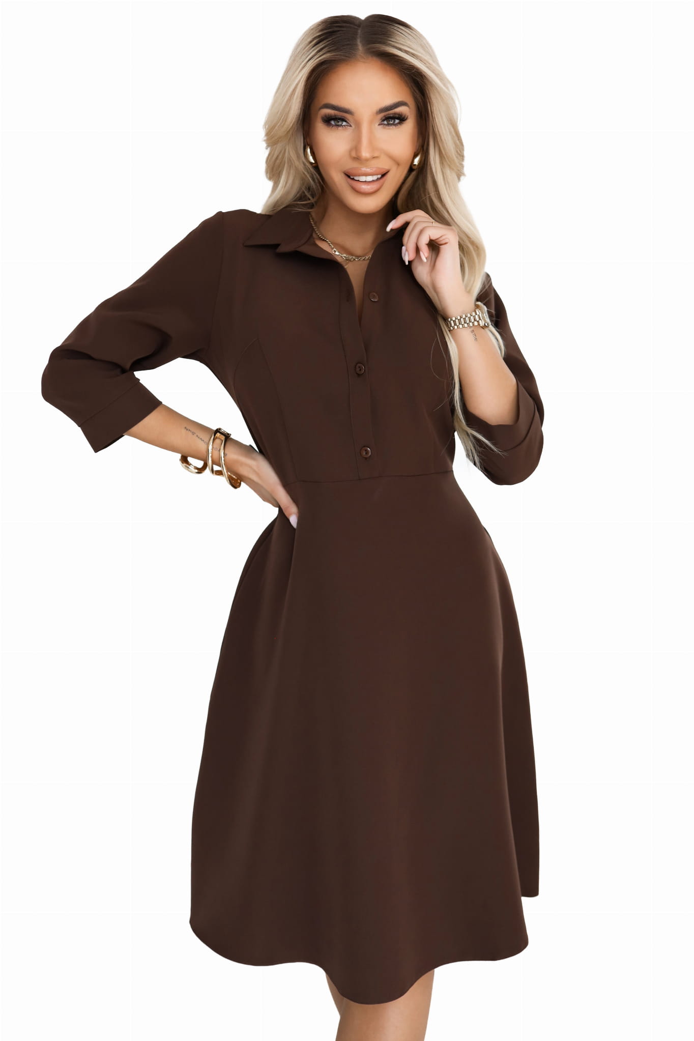 Elegancka czekoladowa szmizjerka midi marki Numoco z kołnierzykiem, rękawem 3/4 i wiązaniem z tyłu. Sukienka z kieszeniami, idealna do pracy, spotkań i na co dzień.