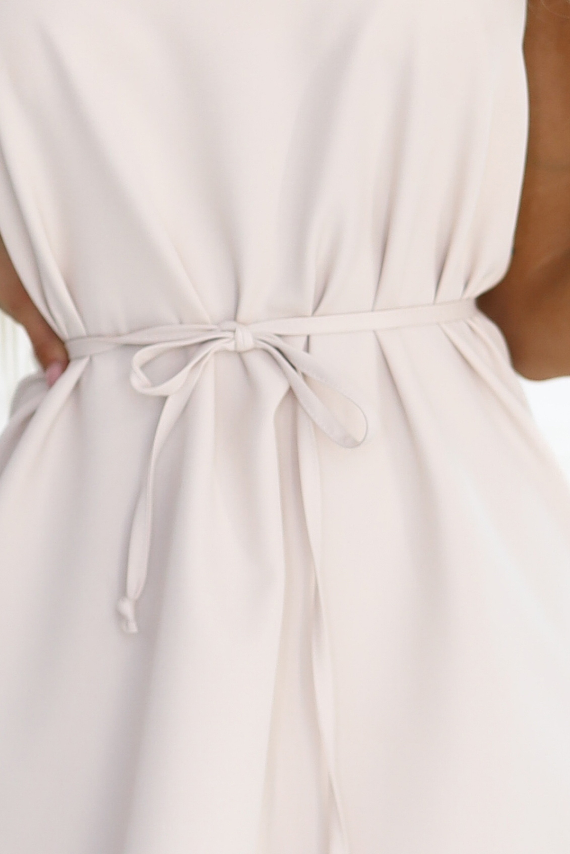 Beżowa trapezowa sukienka Numoco z wiązaniem w talii, rozkloszowana i wygodna. Polska produkcja. Idealna na wesele, komunię, chrzciny i lato.