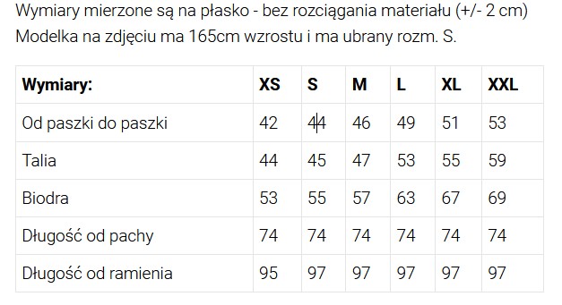 XS: szerokość pod pachami 42 cm x2, talia 44 cm x2, biodra 53 cm x2, długość od pachy 74 cm, długość od ramienia 95 cm