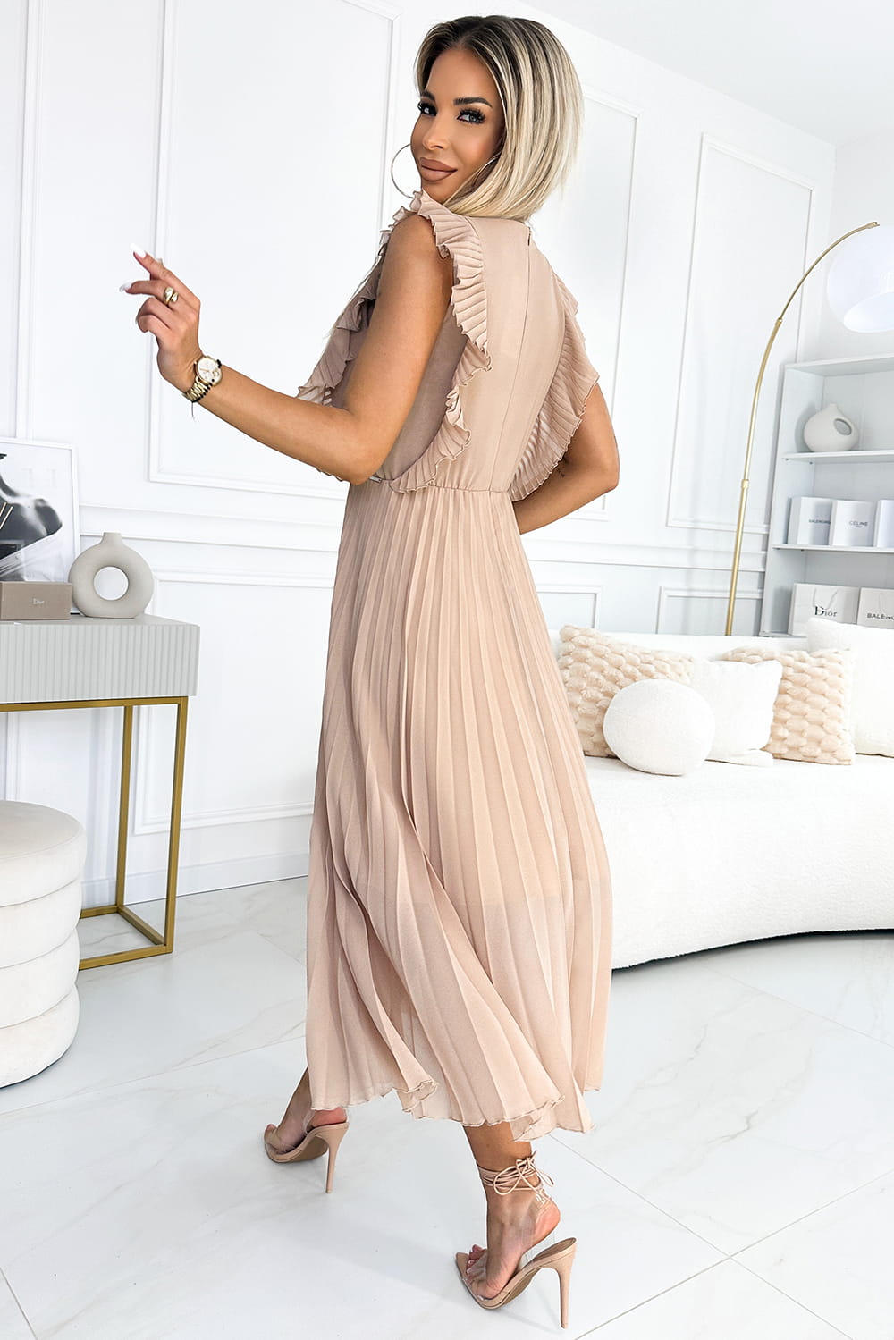 315-6 Plisowana sukienka z falbankami na ramionach i dekoltem - BEŻOWA