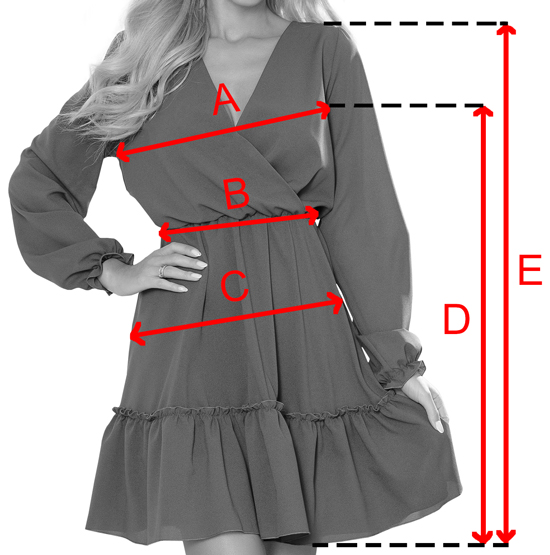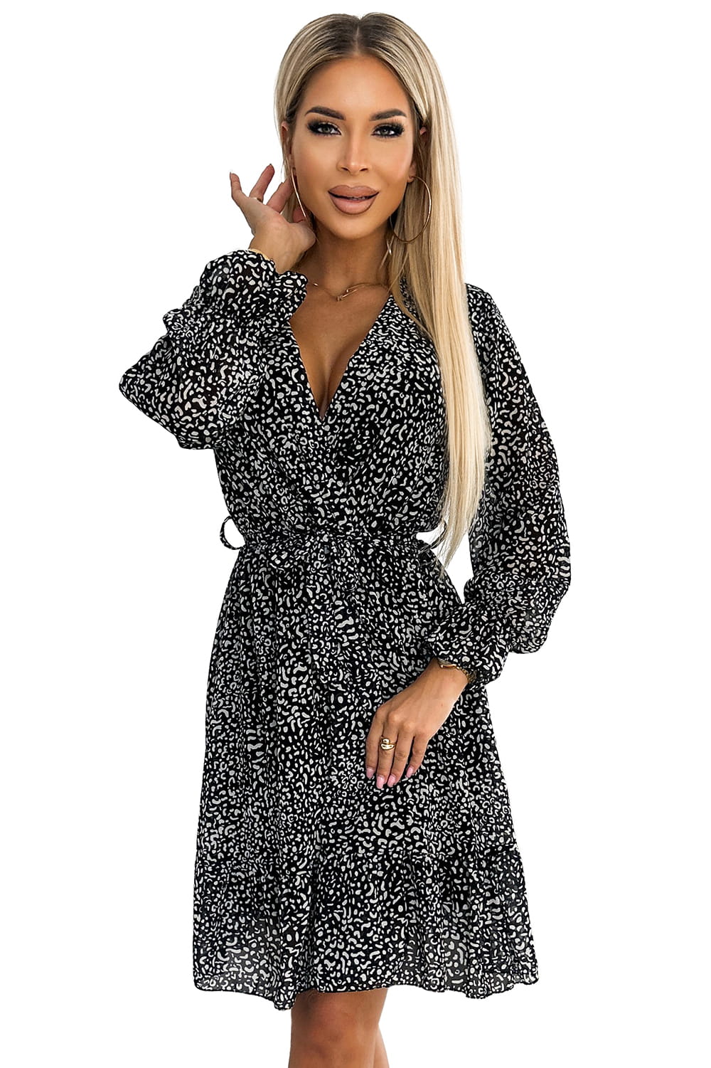 506-1 Szyfonowa sukienka z dekoltem, falbanką i paskiem - czarno-biały wzór