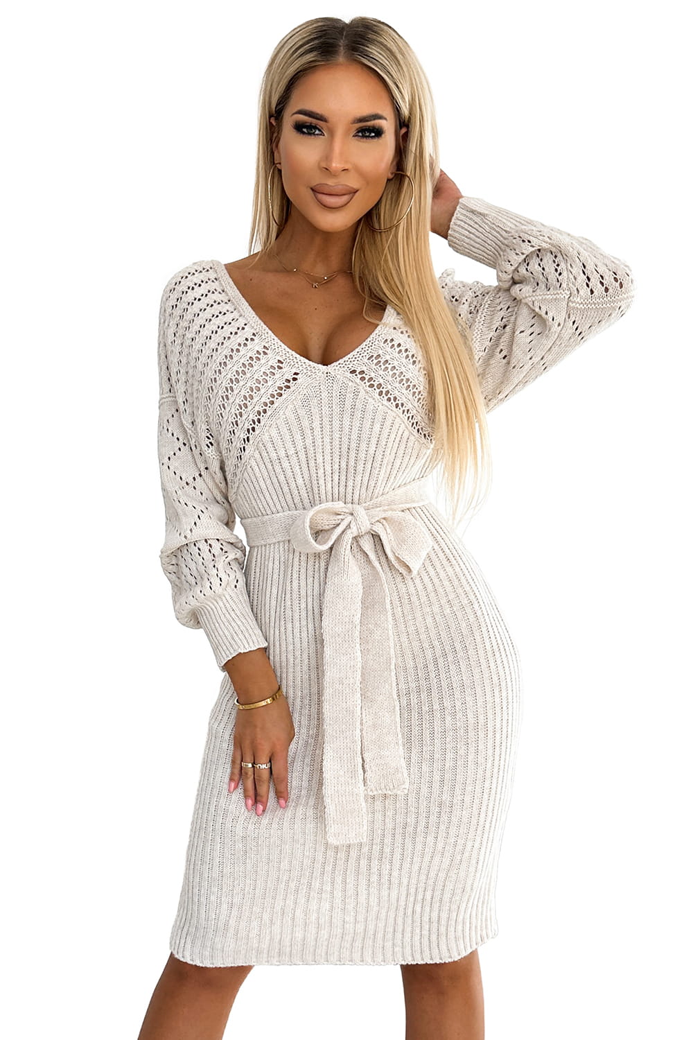 507-1 Dzianinowa ażurowa sukienka z dekoltem i wiązanym paskiem - BEŻOWA