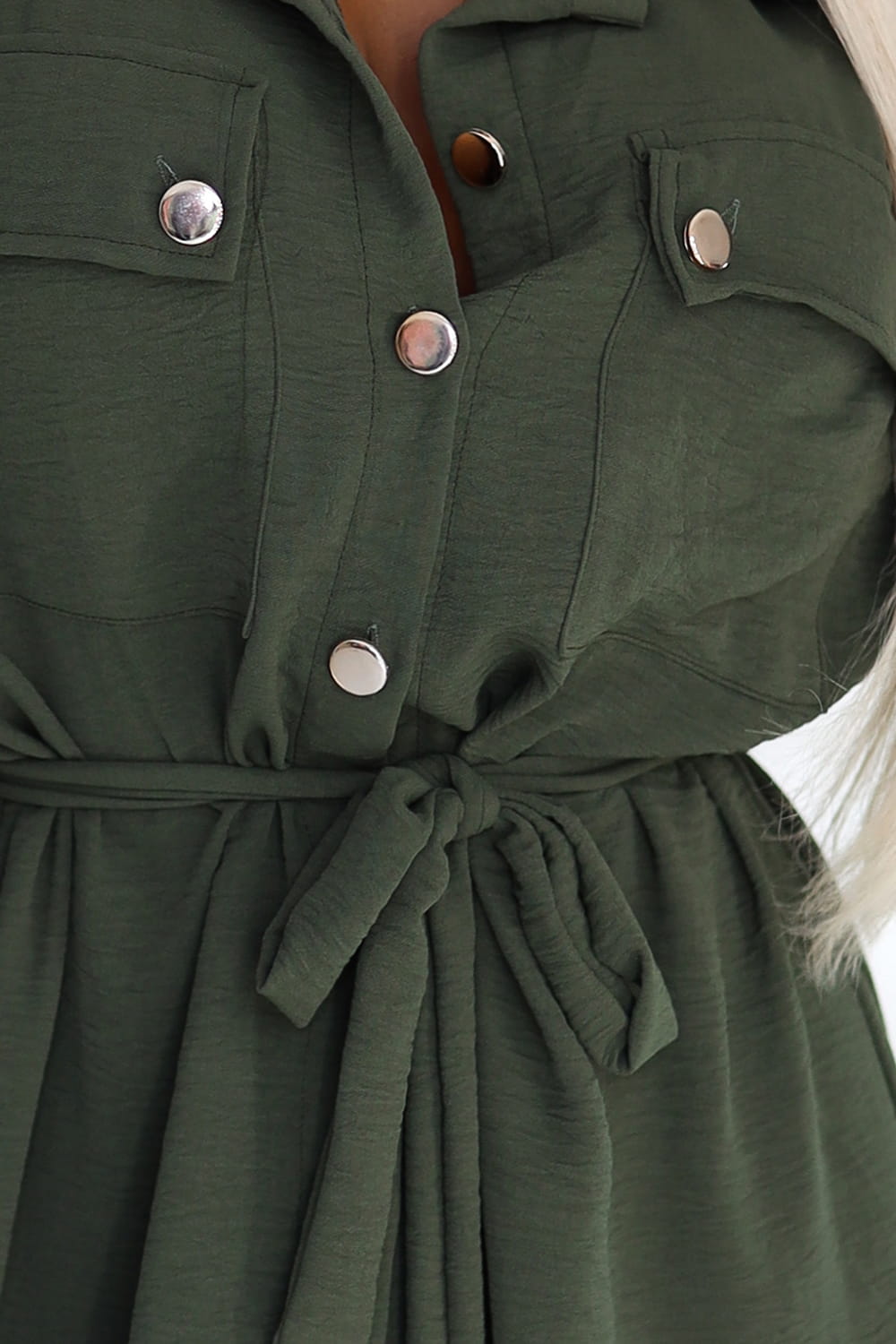 Stylowa szmizjerka w kolorze khaki z paskiem, zapinana na guziki. Idealna na co dzień, do pracy i na spotkania. Produkcja europejska.
