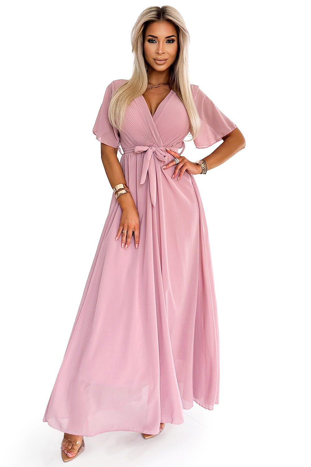 545-1 Długa sukienka z plisowanym dekoltem i wiązanym paskiem - PUDROWY RÓŻ
