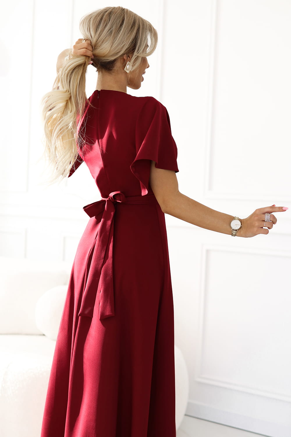 581-2 Długa suknia z rozcięciem na spódnicy, rękawkiem i dekoltem - BORDOWA