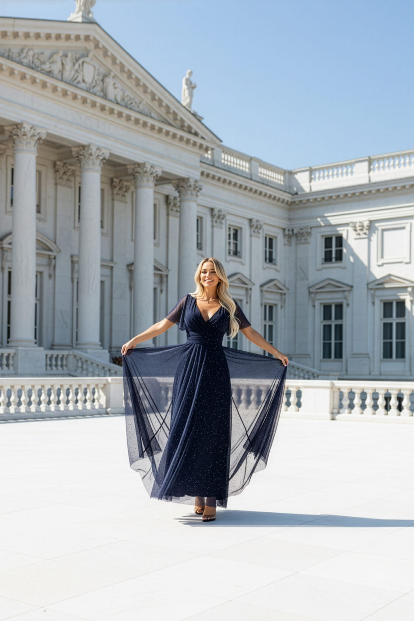 Olśniewająca długa sukienka wieczorowa to propozycja dla kobiet, które lubią wyglądać elegancko i nowocześnie. Granatowa tkanina pokryta drobnymi, błyszczącymi punkcikami przywodzi na myśl rozgwieżdżone niebo, a kopertowy dekolt pięknie podkreśla biust i wysmukla szyję. Zwiewne, delikatnie transparentne rękawki dodają lekkości, a dopasowana w talii góra płynnie przechodzi w luźno opadający dół sukni, tworząc bardzo kobiecą sylwetkę.