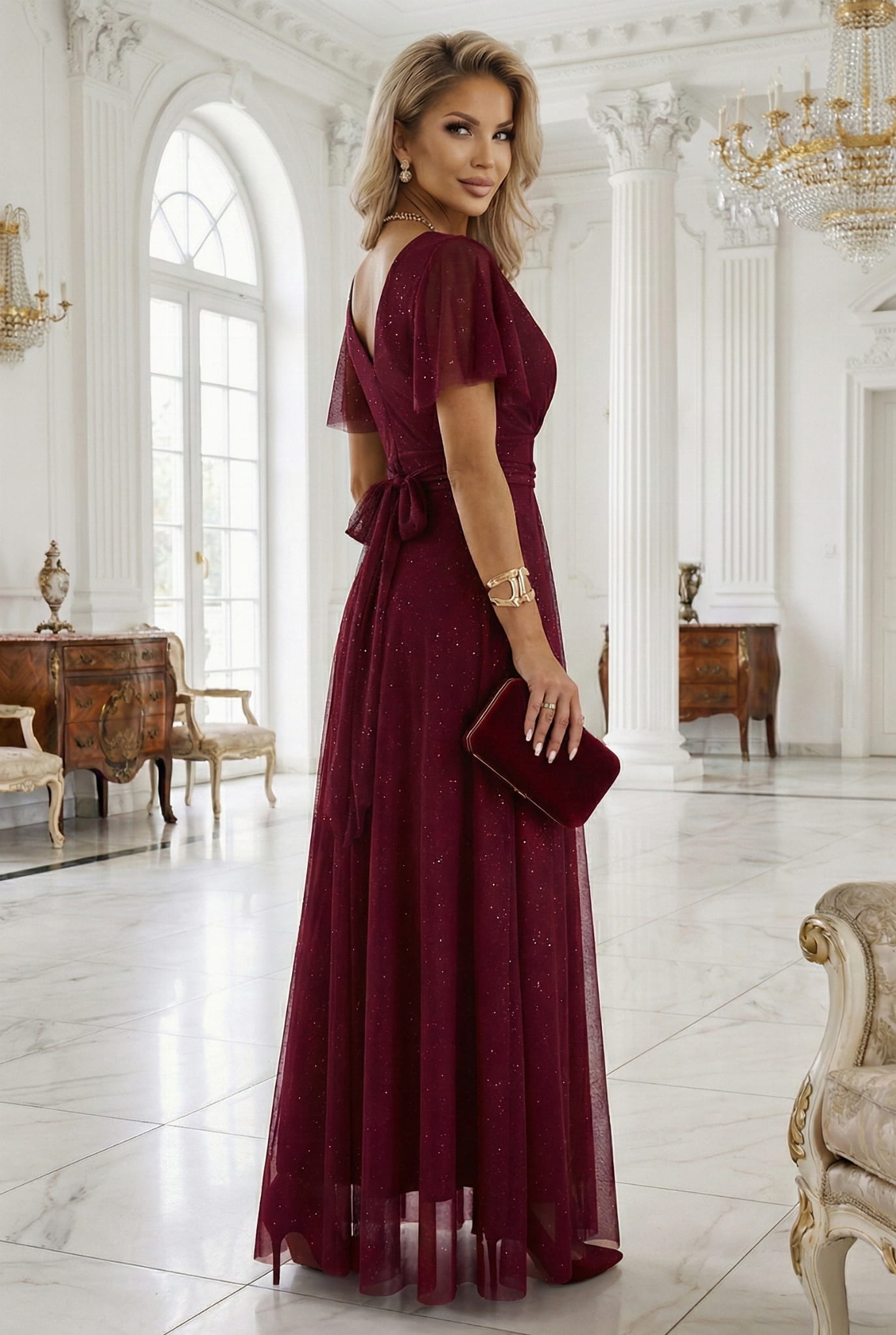 Odkryj bordową suknię maxi z brokatem, efektowny dekolt i zwiewny tiul tworzą kreację idealną na wielkie wyjścia. Poczuj luksus europejskie mody!
