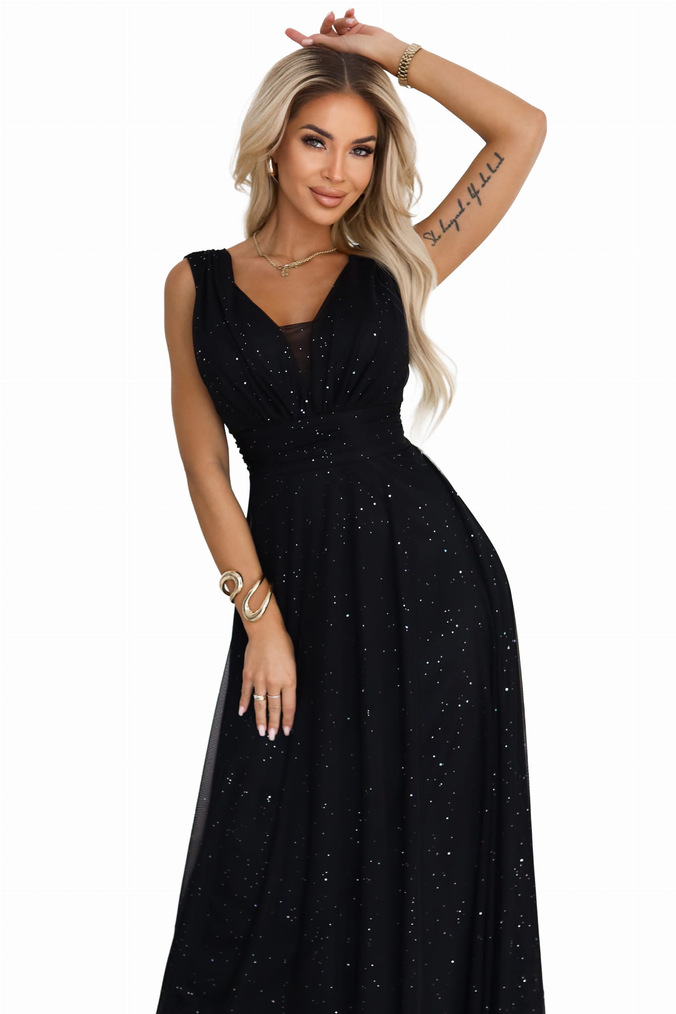 637-2 Wieczorowa długa sukienka z brokatowym akcentem i głębokim dekoltem - czarna