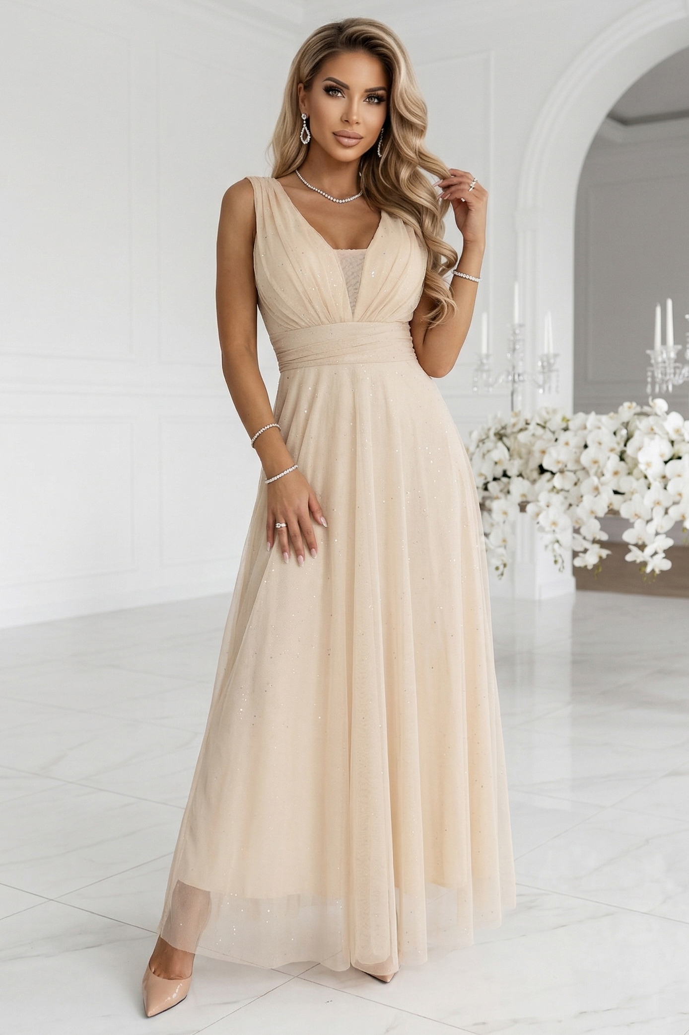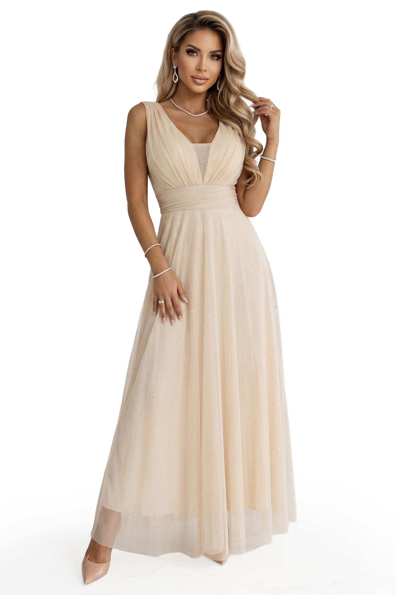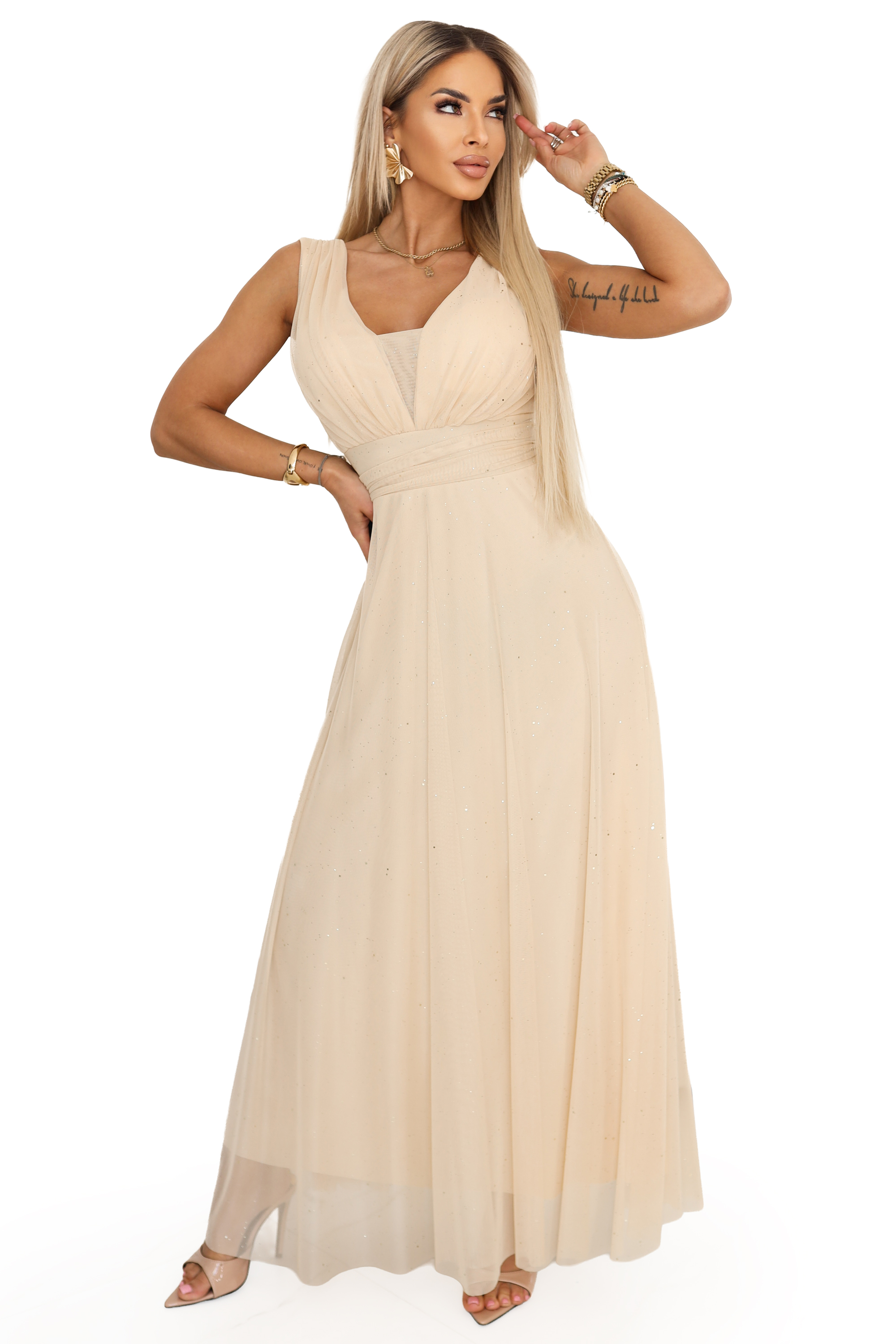 637-4 Długa sukienka maxi z brokatowym połyskiem i głębokim dekoltem - szampański beż