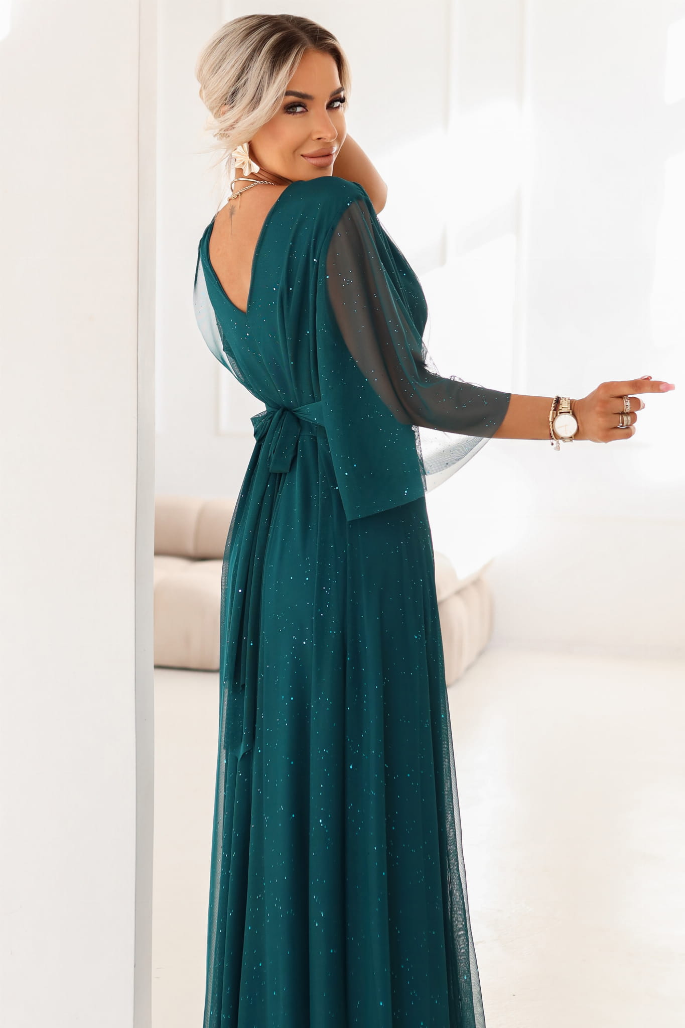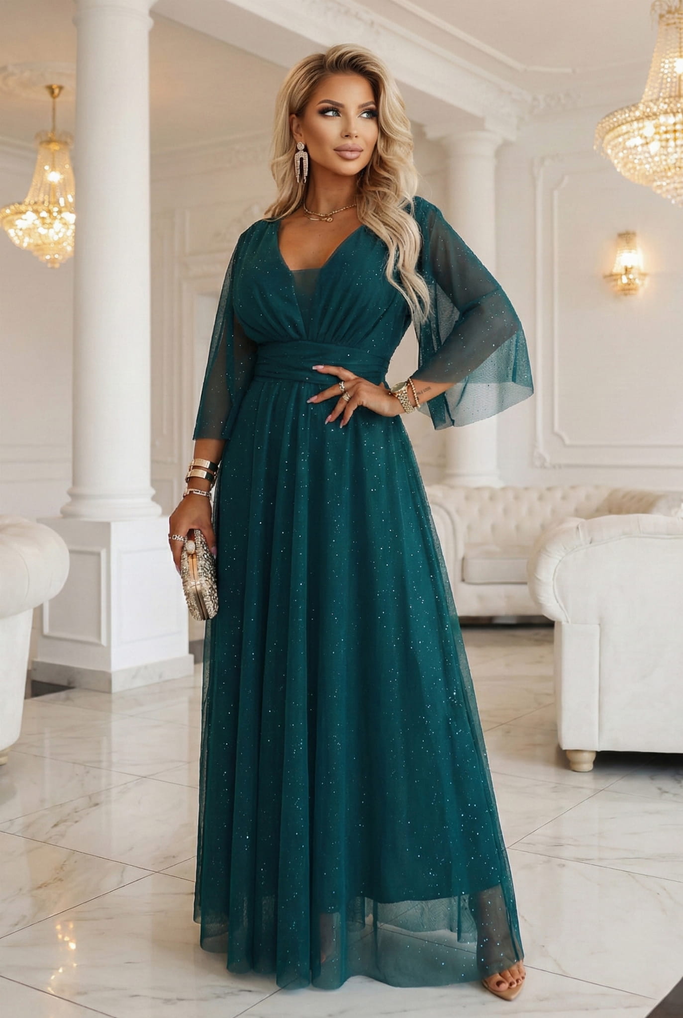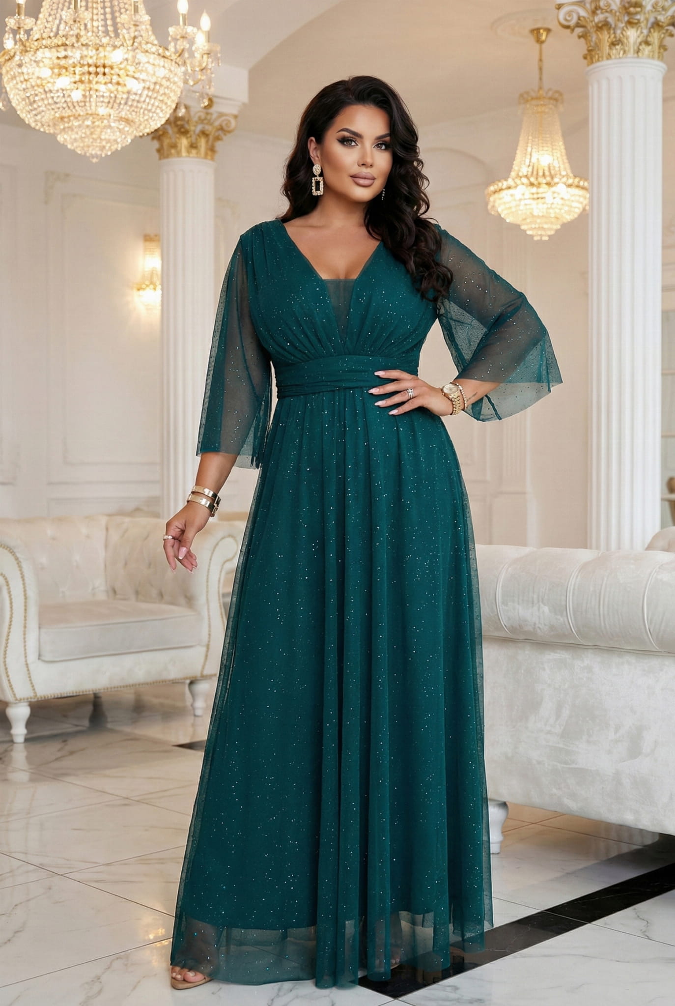 654-1 Długa połyskująca sukienka plus size z dekoltem i transparentnym rękawkiem - zieleń butelkowa