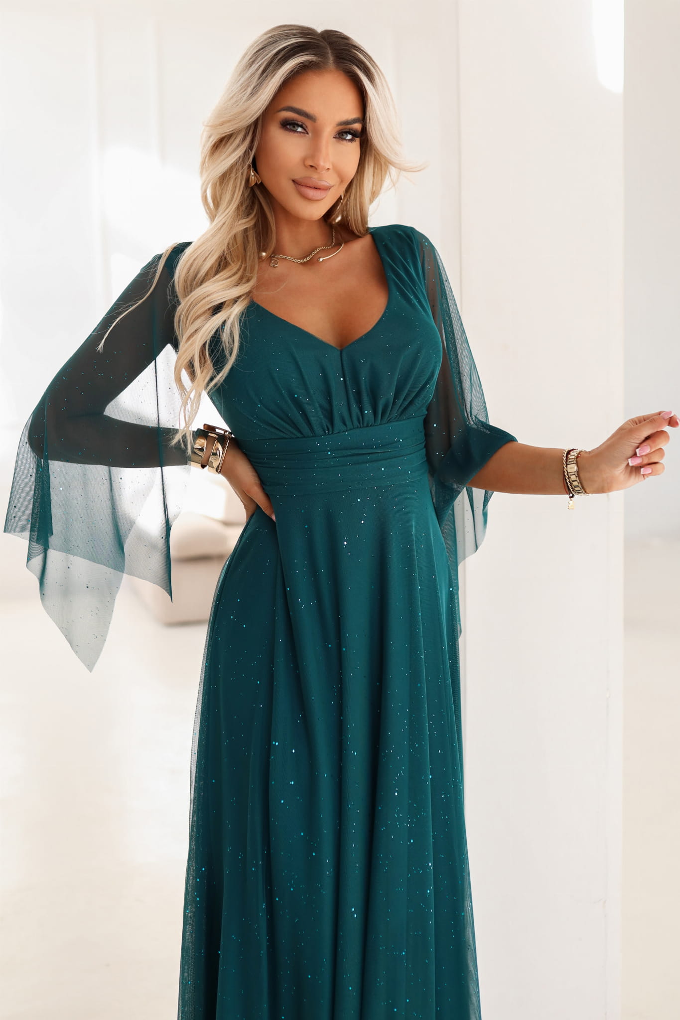 655-2 Długa połyskująca w świetle suknia z dekoltem i transparentnym rękawkiem - szmaragdowa zieleń