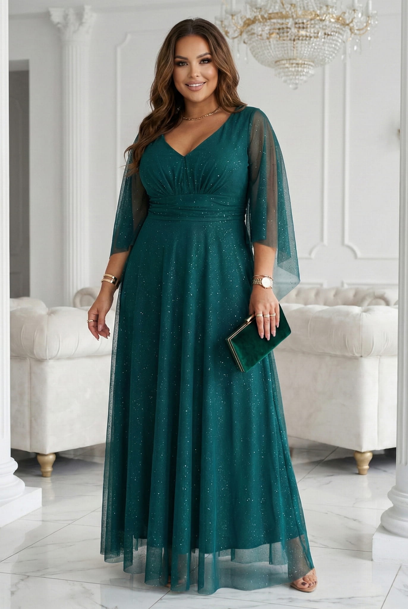 Misternie dobrany, lekki materiał z subtelnym brokatowym połyskiem podkreśla ruch i łapie światło w sposób, który trudno przeoczyć. Kopertowy dekolt V pięknie modeluje górę sylwetki, a szeroki pas w talii tworzy efekt naturalnego wysmuklenia. Zwiewne rękawy typu „motyl” dodają delikatności i - co ważne - nie ograniczają ruchów, dzięki czemu cała stylizacja wygląda lekko i harmonijnie.