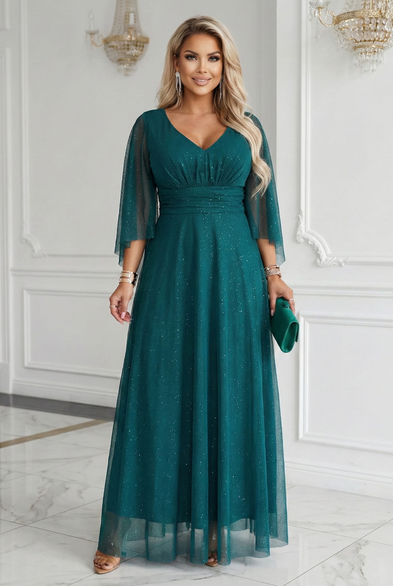 - wieczorowa sukienka maxi z migotliwym wykończeniem,