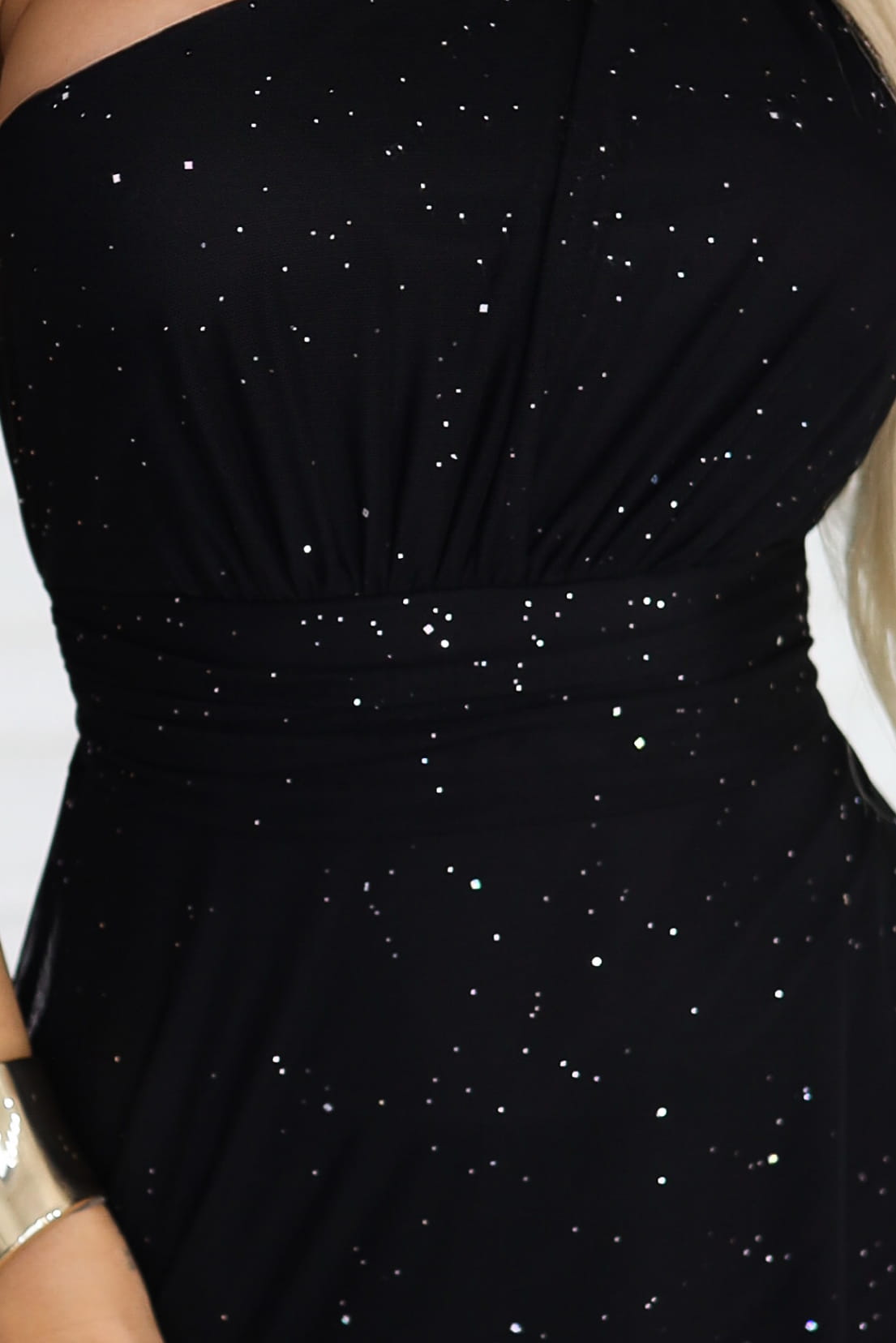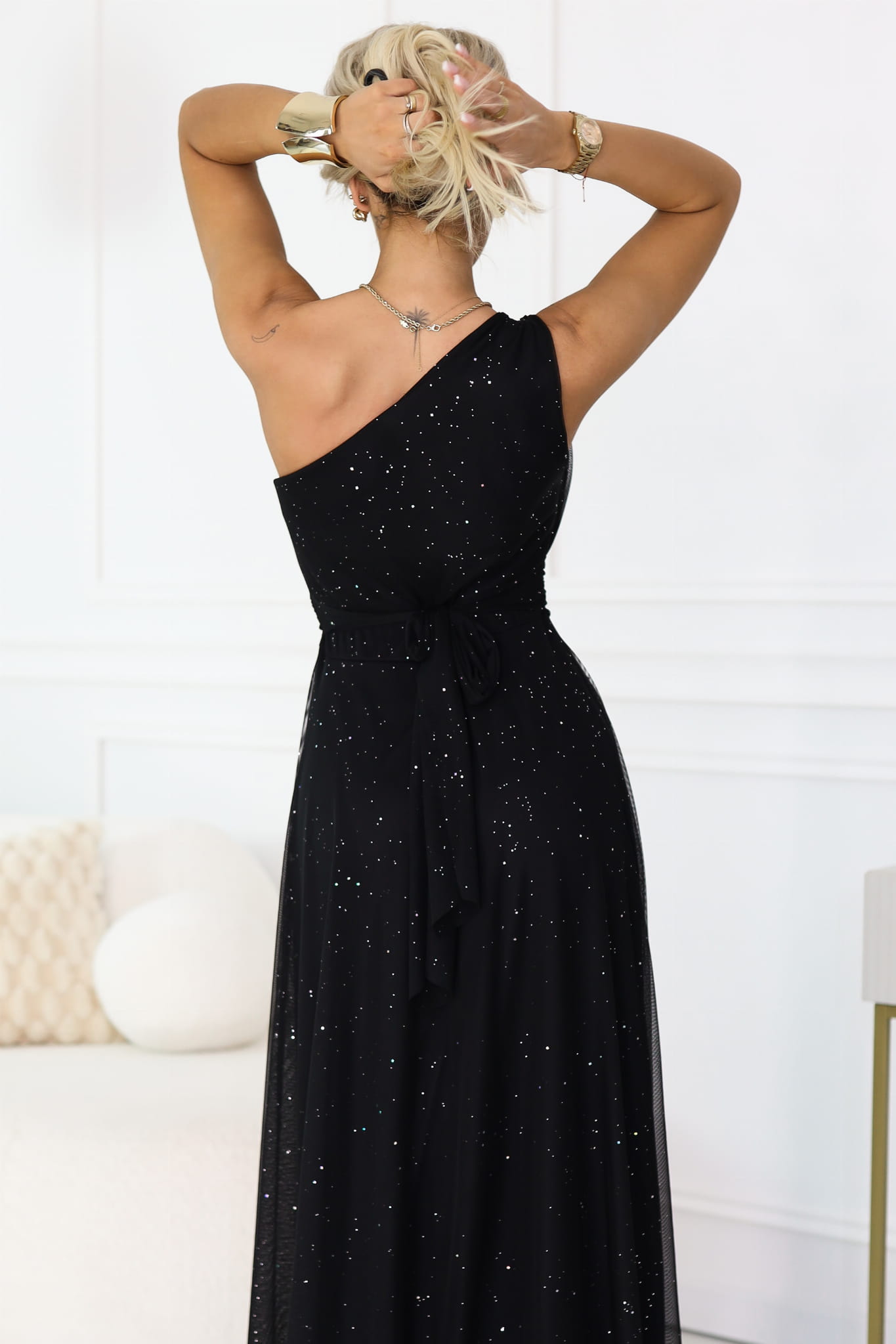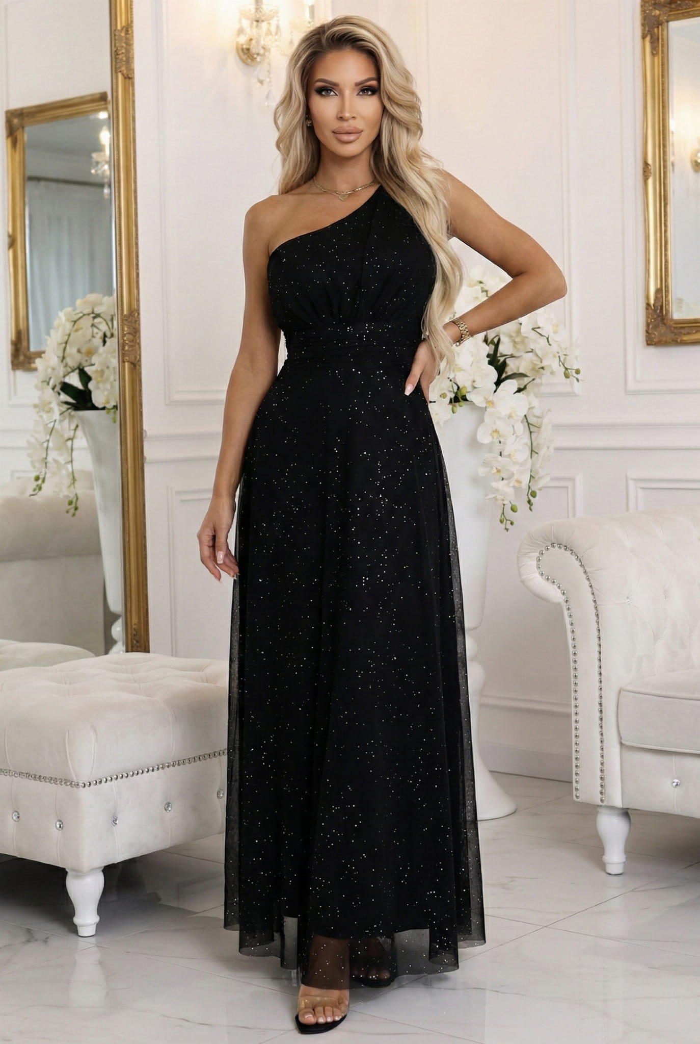 Czarna sukienka maxi z brokatowym połyskiem na jedno ramię