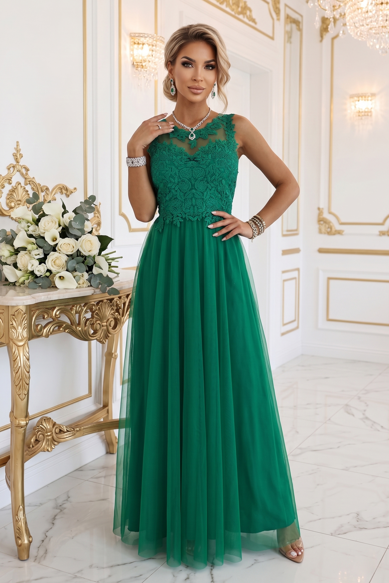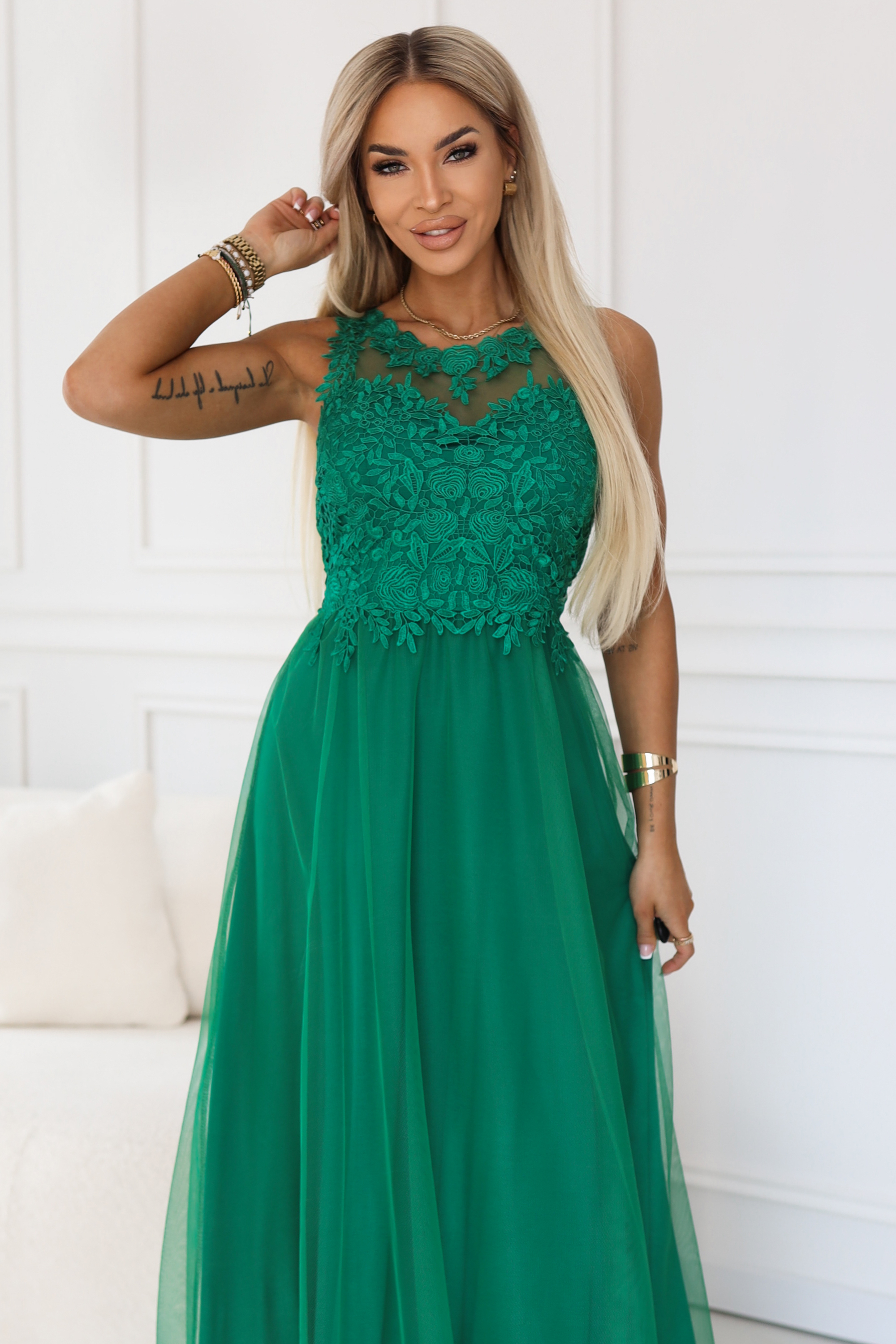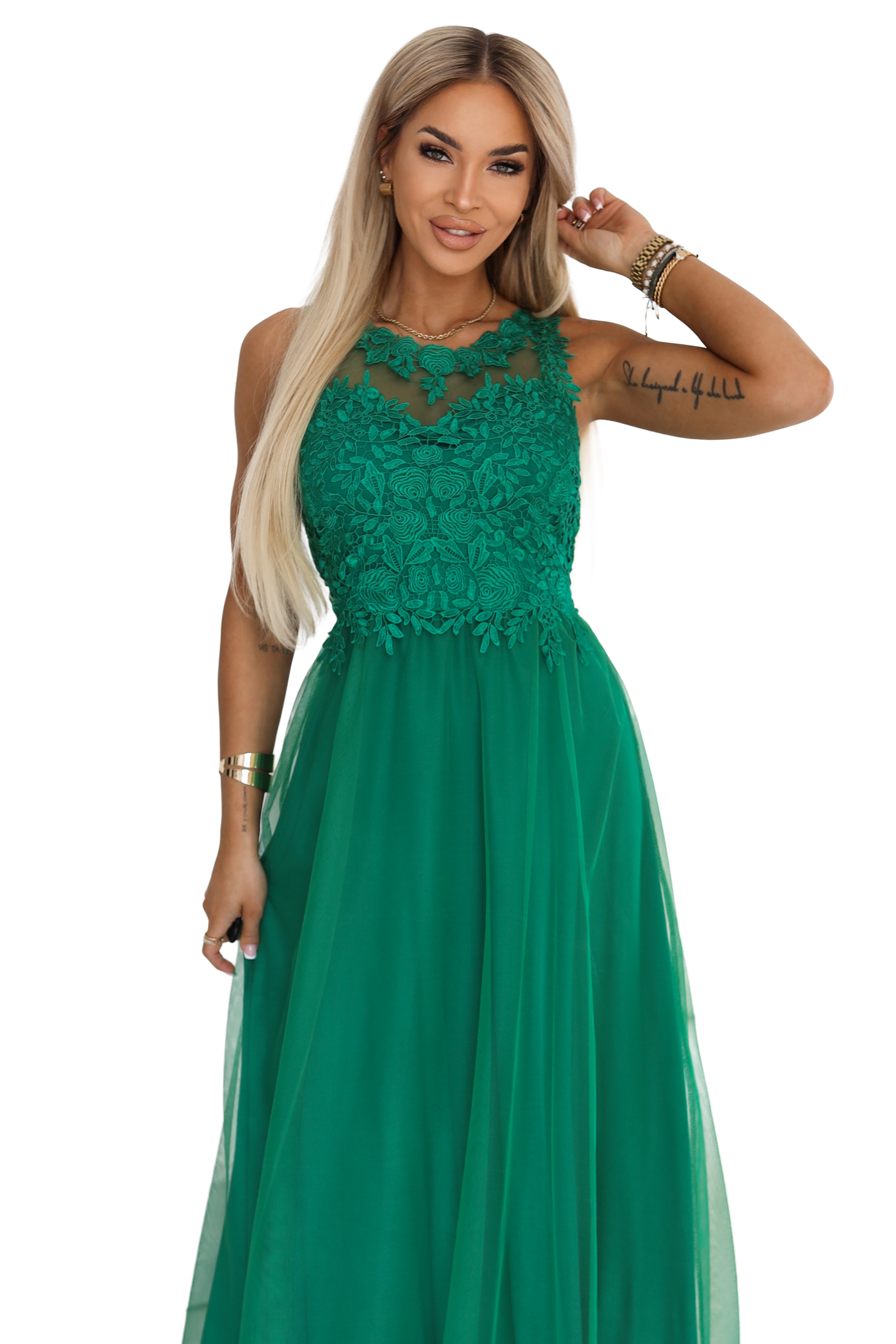 Zielona tiulowa sukienka maxi z haftowaną koronką - Numoco Basic