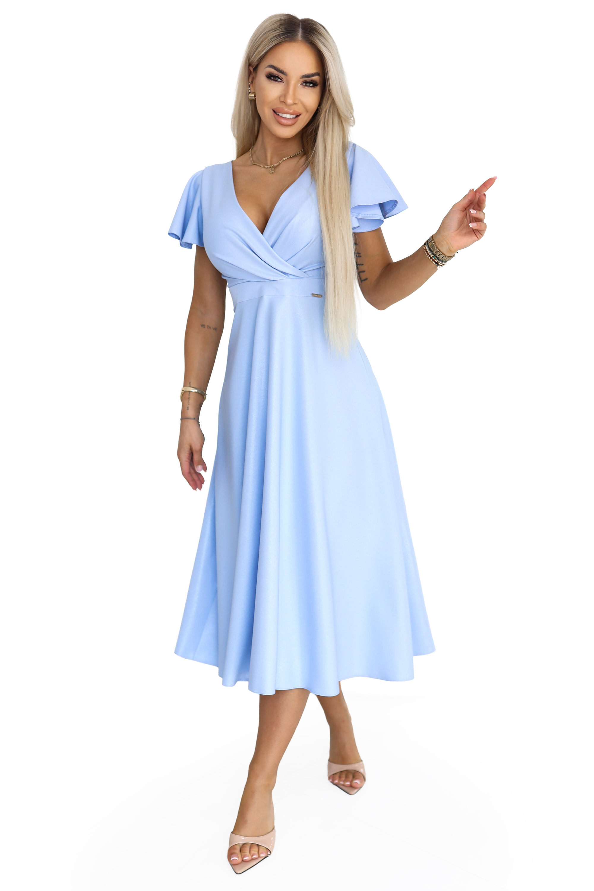 675-1 Rozkloszowana sukienka midi z kopertowym dekoltem i brokatowym połyskiem - błękitna
