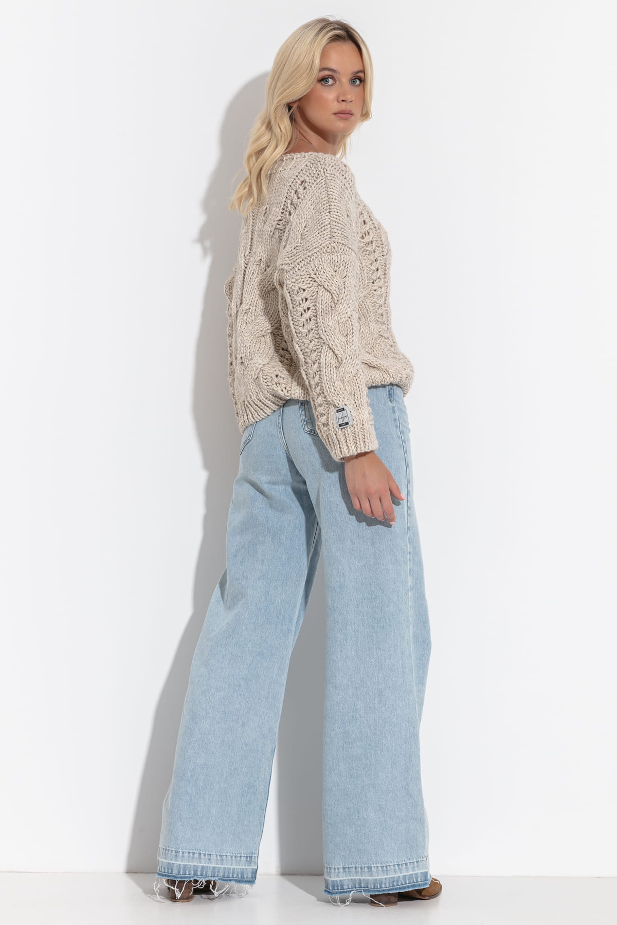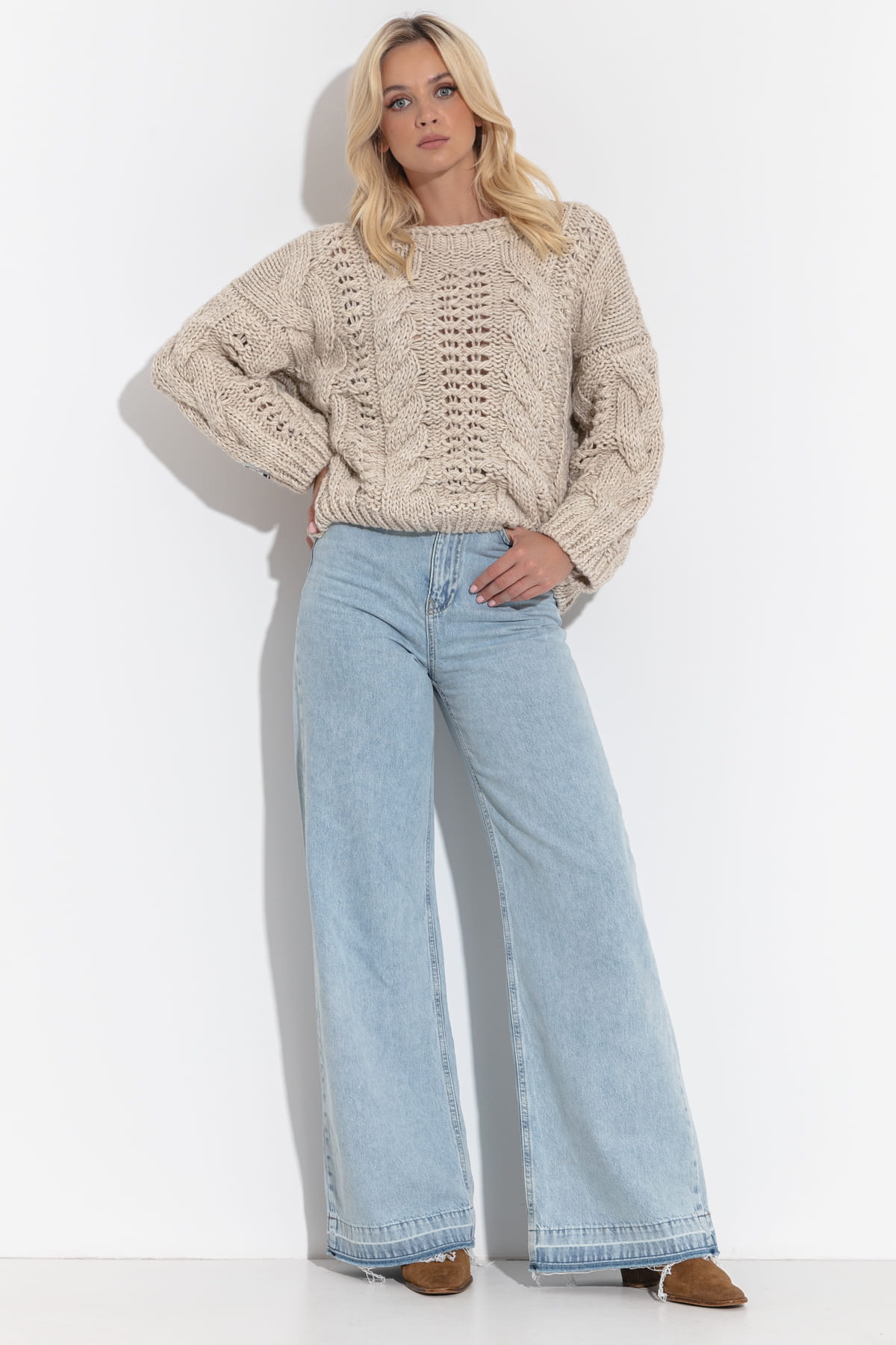 Ażurowy wełniany sweter o grubym splocie F1318 beżowy