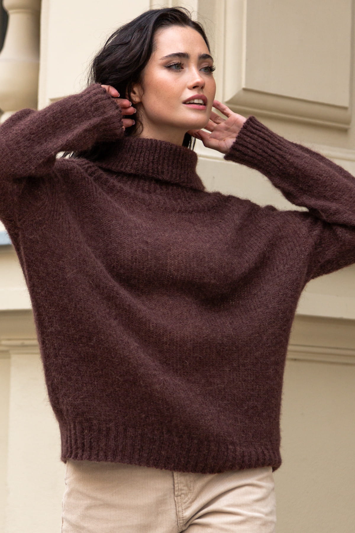 Bezszwowy sweter oversize z golfem z wełny kid moher i merynos F1750 brązowy