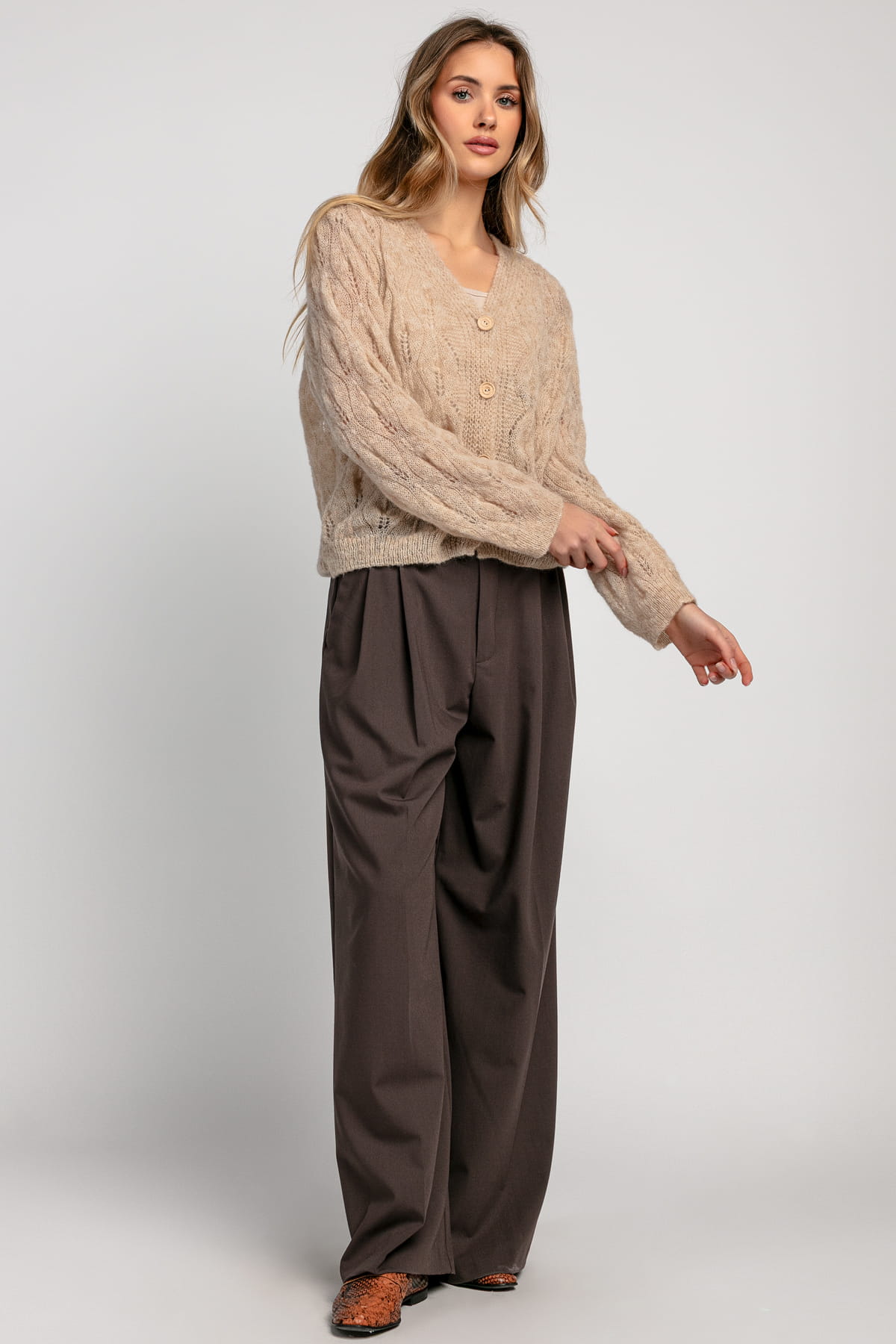Projekt stworzony dla kobiet, które cenią połączenie ponadczasowej klasyki z nowoczesną estetyką. Ażurowa struktura nadaje mu lekkości, a oversize’owy krój pozwala na swobodę ruchu i zabawę proporcjami. Drewniane guziki nawiązują do szlachetnego rzemiosła, podkreślając naturalny charakter projektu.