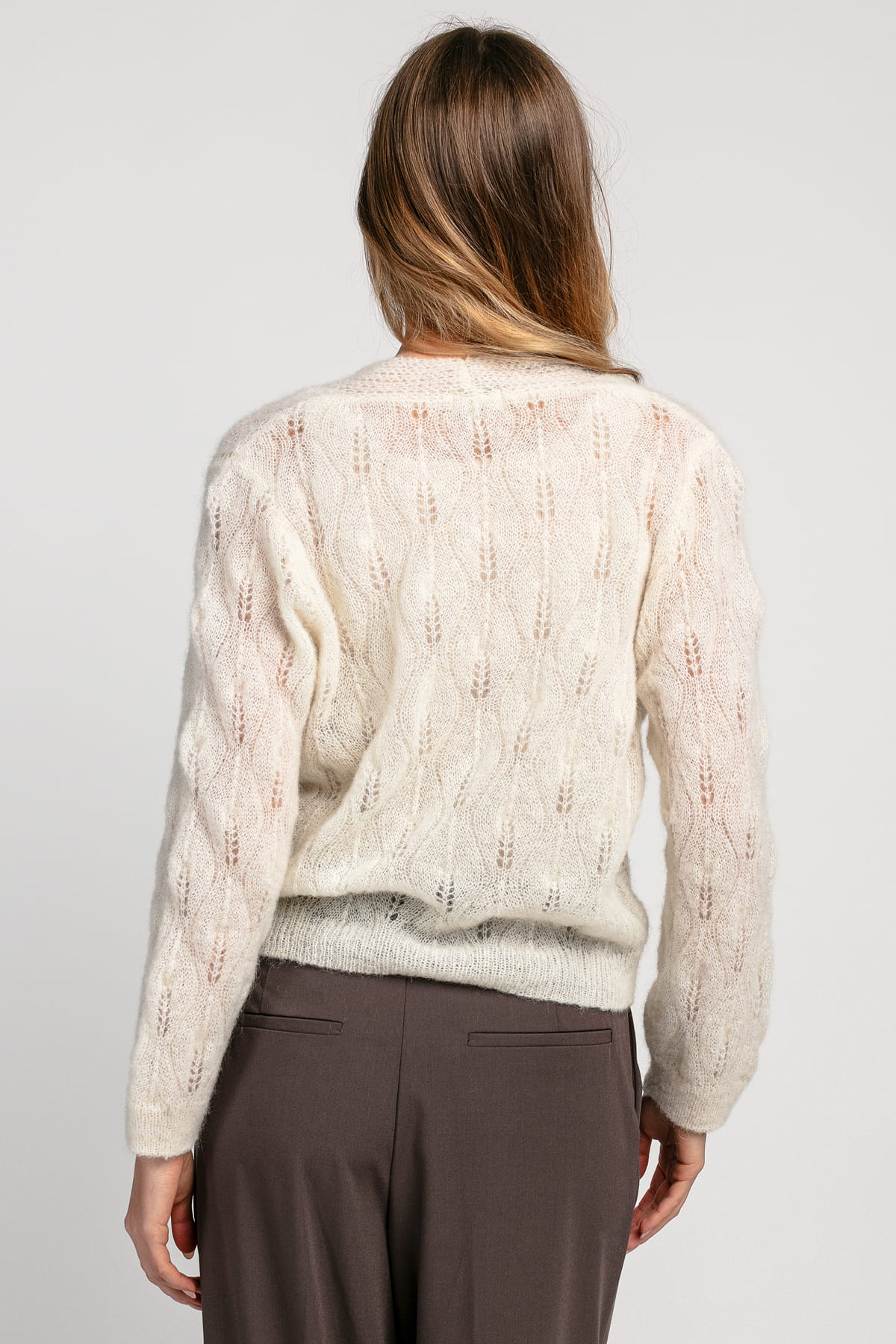 Delikatny ażurowy kardigan mgiełka z wełny alpaki F1967 ecru