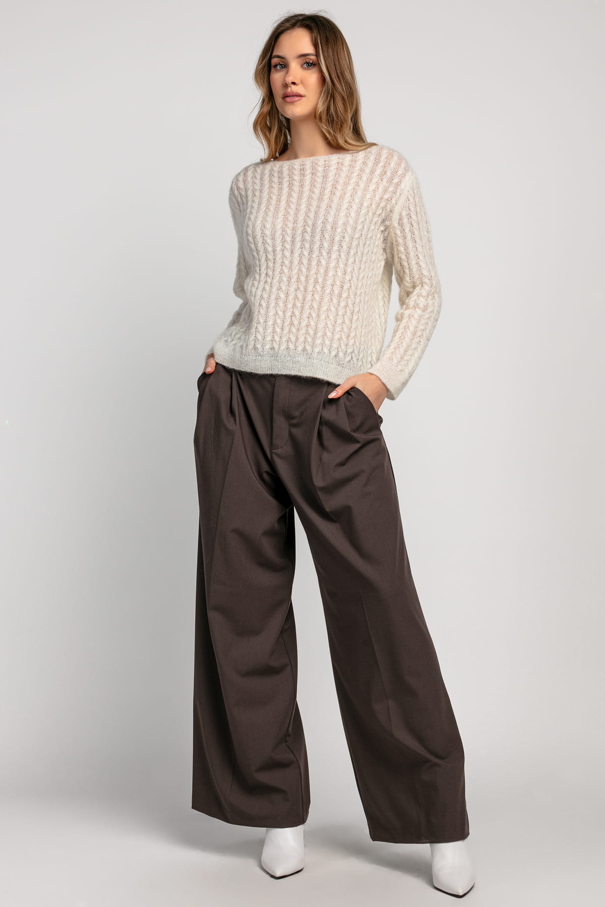 Dzięki ultralekkiej strukturze, sweter nie obciąża sylwetki, zapewniając niezwykłe uczucie komfortu i swobody ruchów. Naturalne włókna alpaki gwarantują miękkość oraz optymalną termoregulację, co czyni ten model idealnym zarówno na chłodne poranki, jak i na wieczorne wyjścia.
