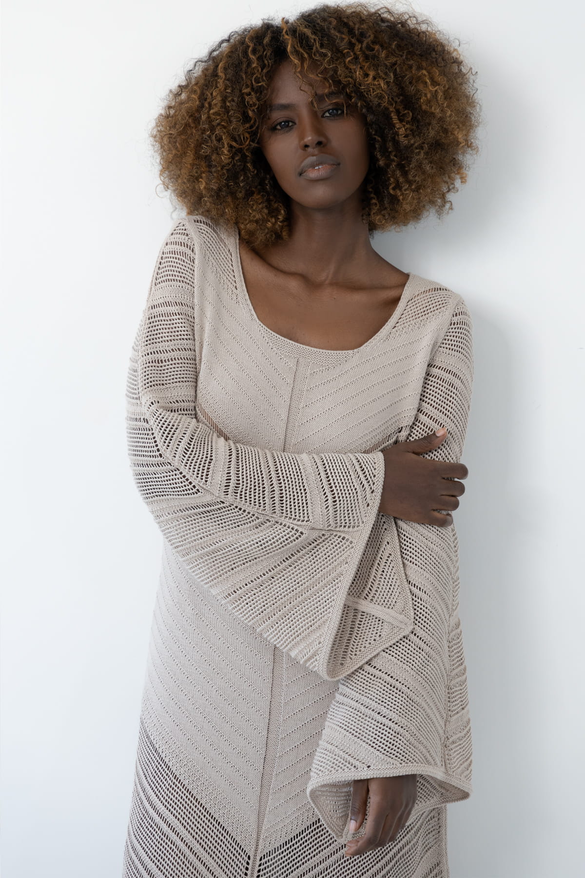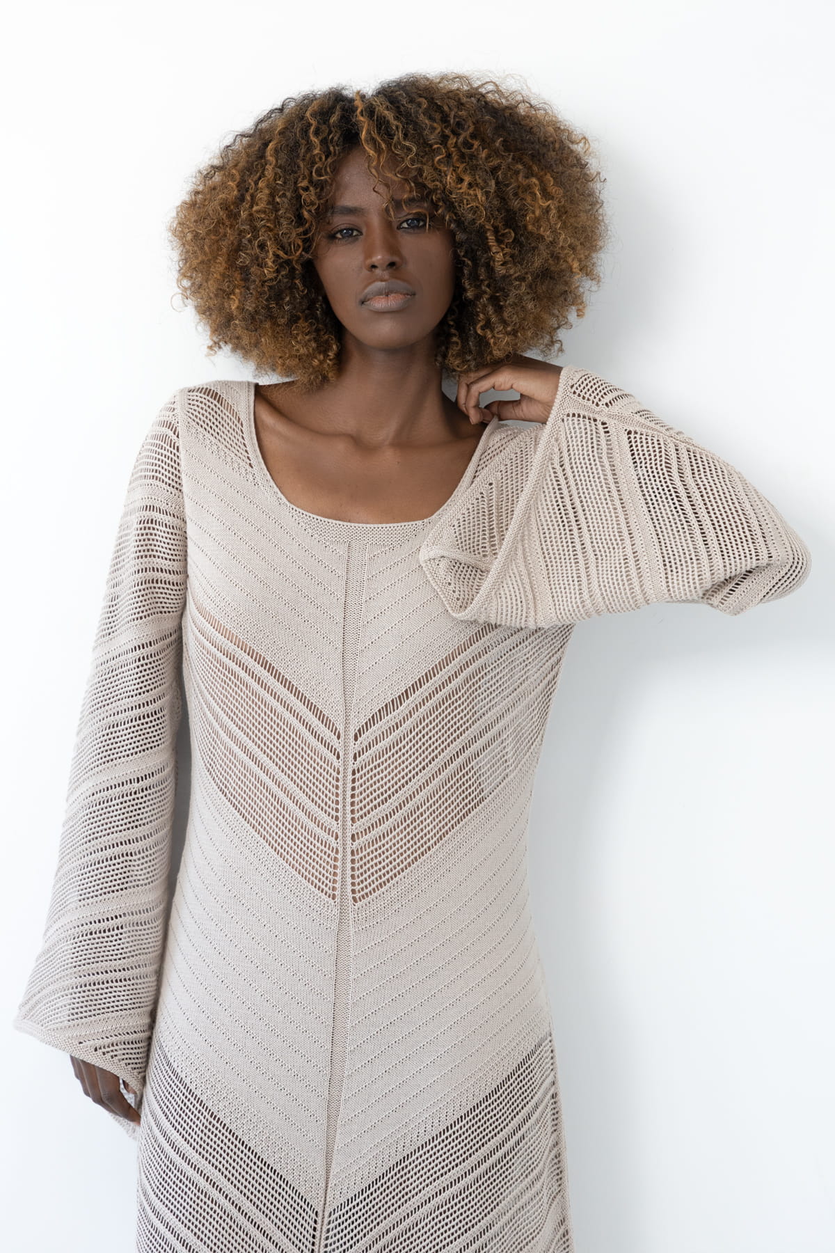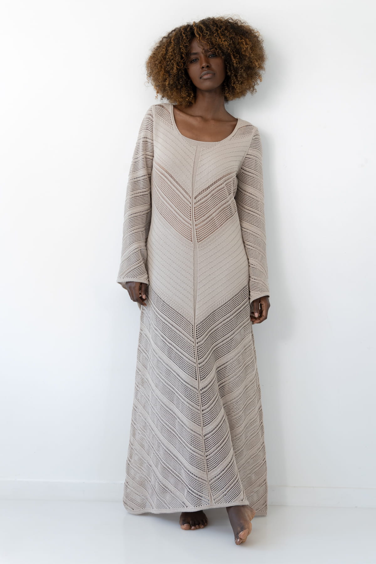 Ta długa ażurowa sukienka to nie tylko stylizacja – to sposób na wyrażenie siebie. Uszyta z oddychającej, przyjemnej dla skóry dzianiny bawełnianej, delikatnie otula ciało, tworząc efekt subtelnej zmysłowości i swobodnej elegancji. Ażurowy splot nie tylko przyciąga spojrzenia, ale też dodaje lekkości i pozwala skórze oddychać – idealnie na ciepłe, letnie dni.