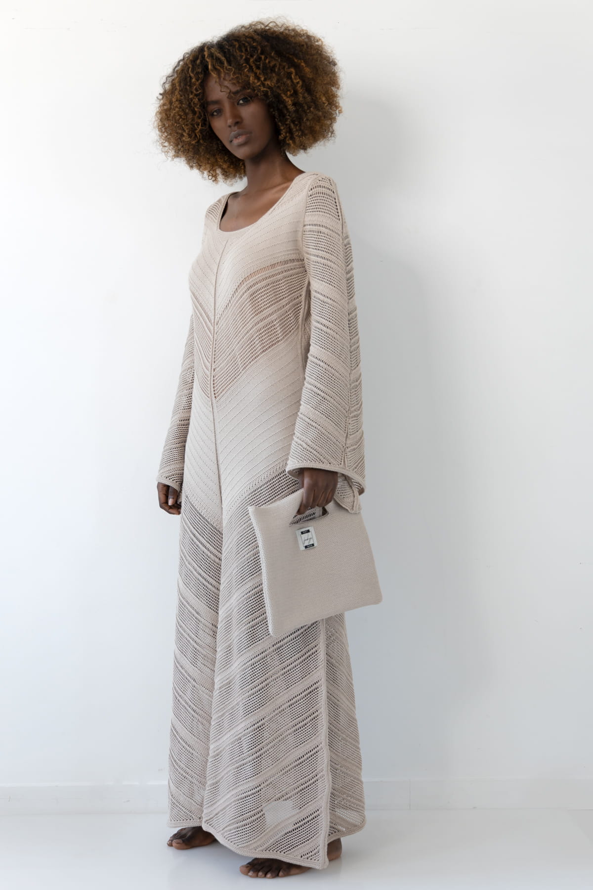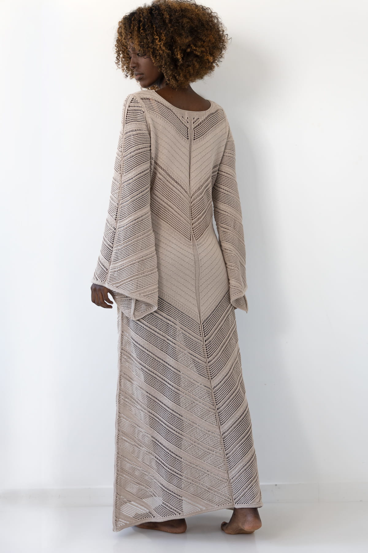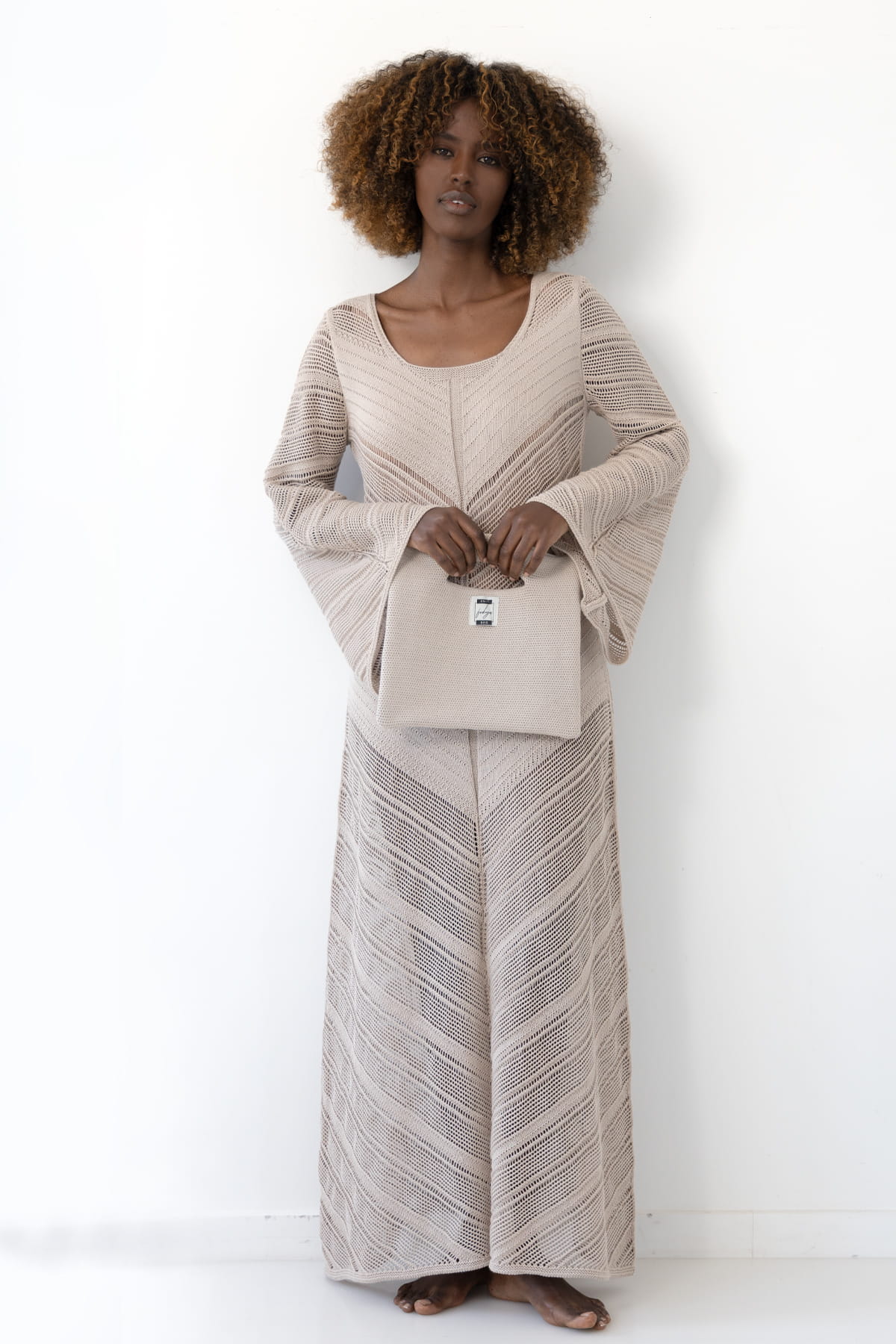 Ta długa ażurowa sukienka to nie tylko stylizacja – to sposób na wyrażenie siebie. Uszyta z oddychającej, przyjemnej dla skóry dzianiny bawełnianej, delikatnie otula ciało, tworząc efekt subtelnej zmysłowości i swobodnej elegancji. Ażurowy splot nie tylko przyciąga spojrzenia, ale też dodaje lekkości i pozwala skórze oddychać – idealnie na ciepłe, letnie dni.