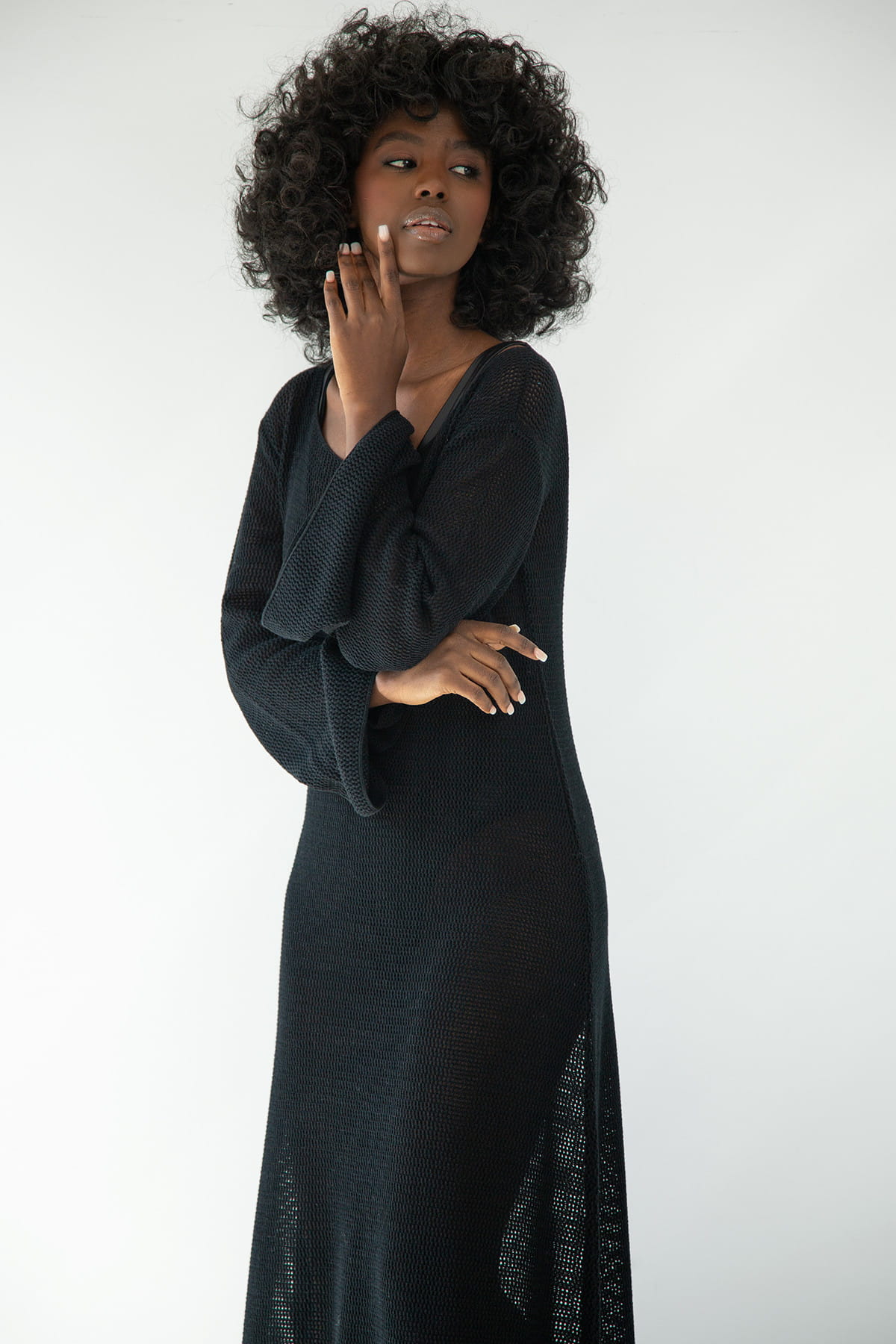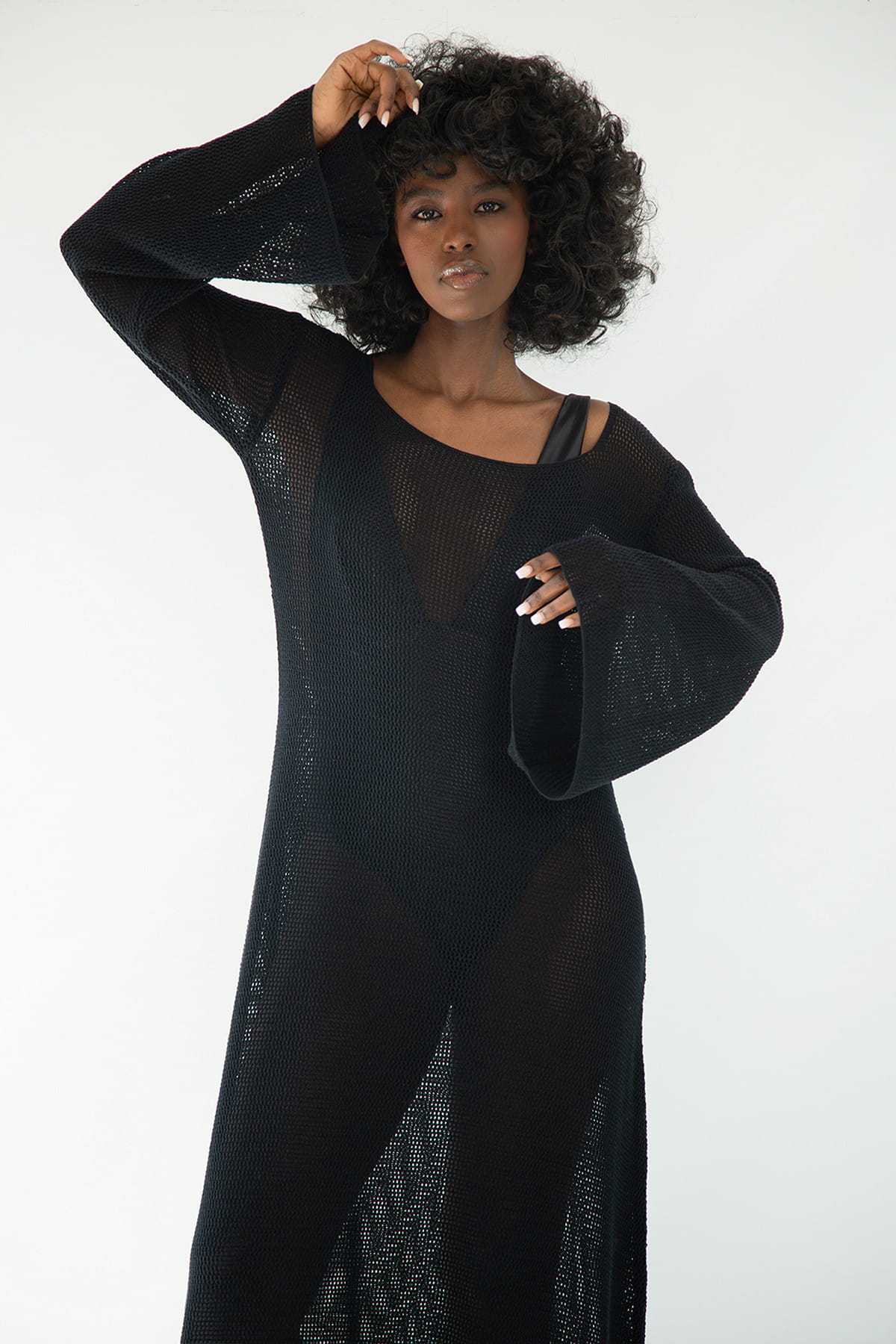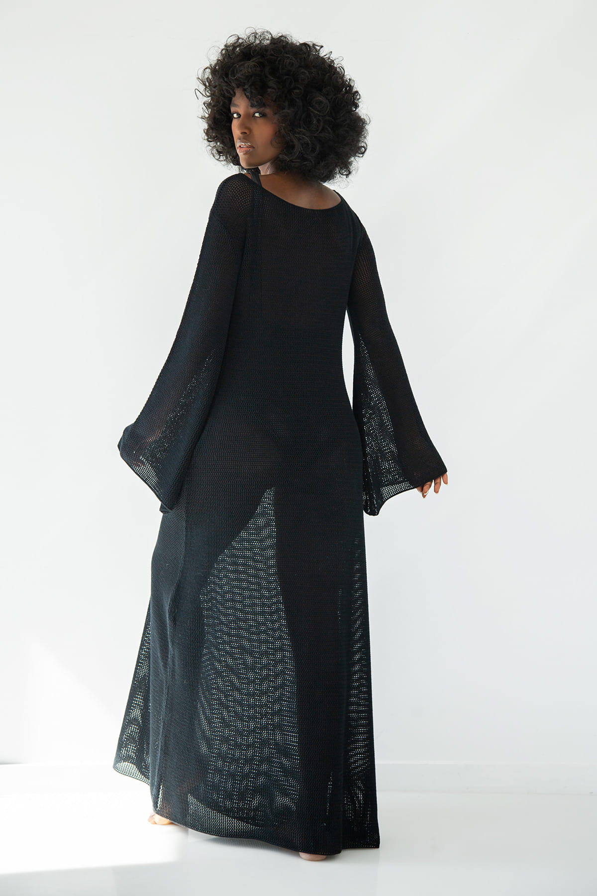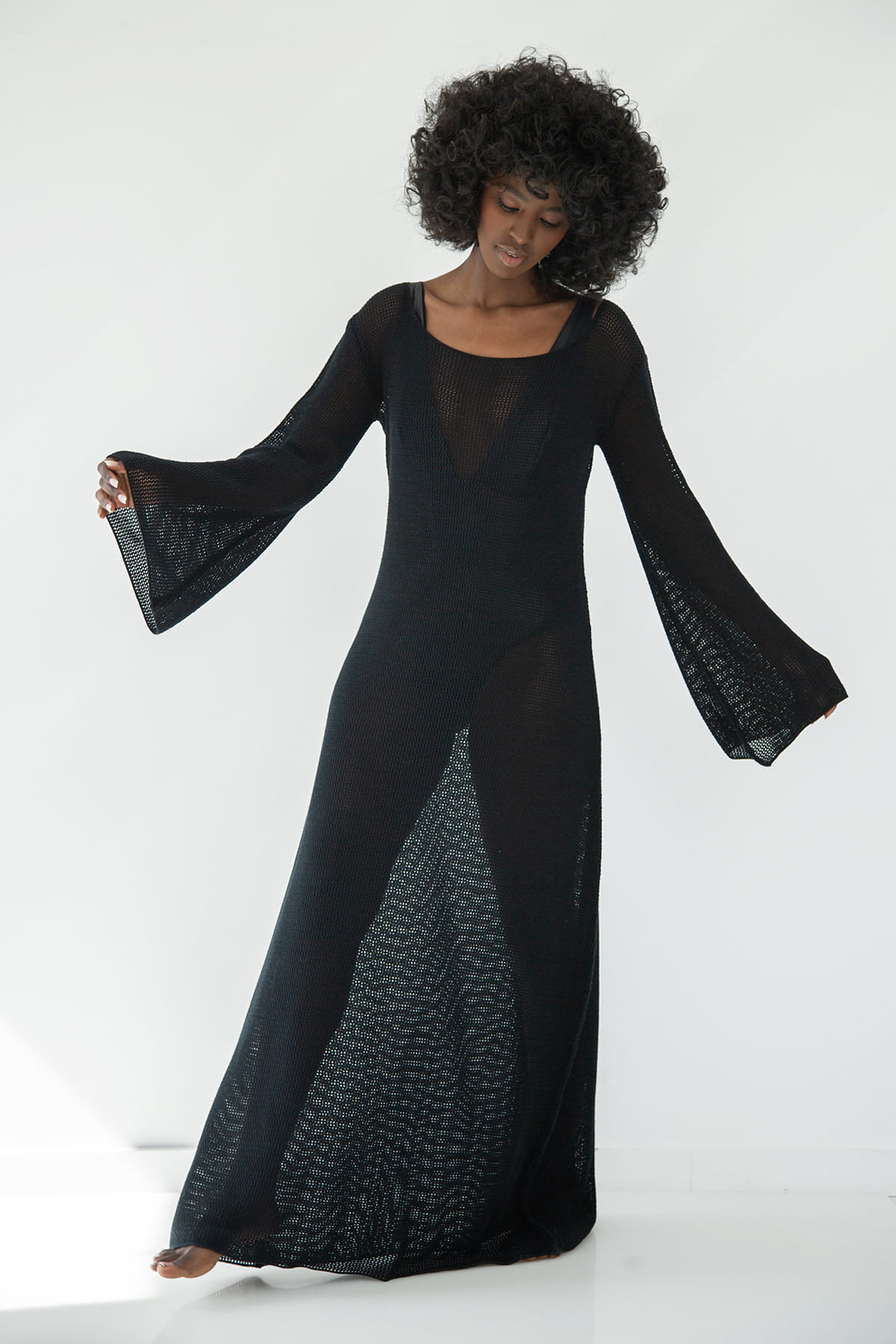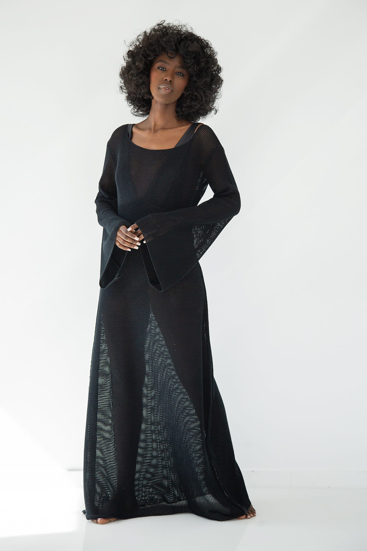 Ta zachwycająca, długa sukienka ażurowa na lato łączy w sobie delikatność i elegancję, idealnie komponując się z letnim krajobrazem. Sukienka posiada klasyczny, okrągły dekolt, który pięknie podkreśla linię szyi, jednocześnie zapewniając subtelny, ale wyrafinowany wygląd. Dół sukienki jest lekko rozkloszowany, co doskonale komponuje z lekko poszerzanymi rękawami, dodając całości romantycznego charakteru.