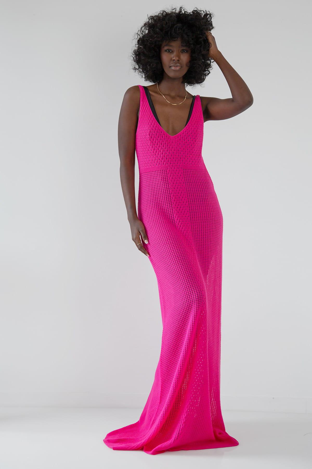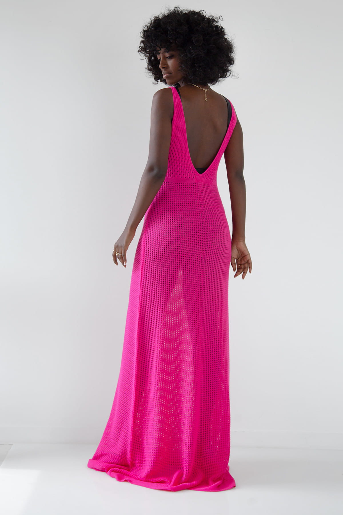 Przepiękna, długa sukienka wykonana delikatnym ażurowym splotem, idealnie sprawdzi się podczas letnich dni i wieczorów. Głęboki dekolt w serek na przodzie oraz na plecach nadaje jej subtelnego seksapilu, jednocześnie zachowując klasę i elegancję. Sukienka posiada delikatnie rozkloszowany dół, doskonale dopasowuje się do różnych typów sylwetek. Jej lekka, przewiewna konstrukcja i bawełniana dzianina, z której została wykonana, zapewni komfort nawet w najgorętsze dni. Ta długa ażurowa sukienka idealnie nadaje się na letnie spacery czy romantyczne letnie kolacje.