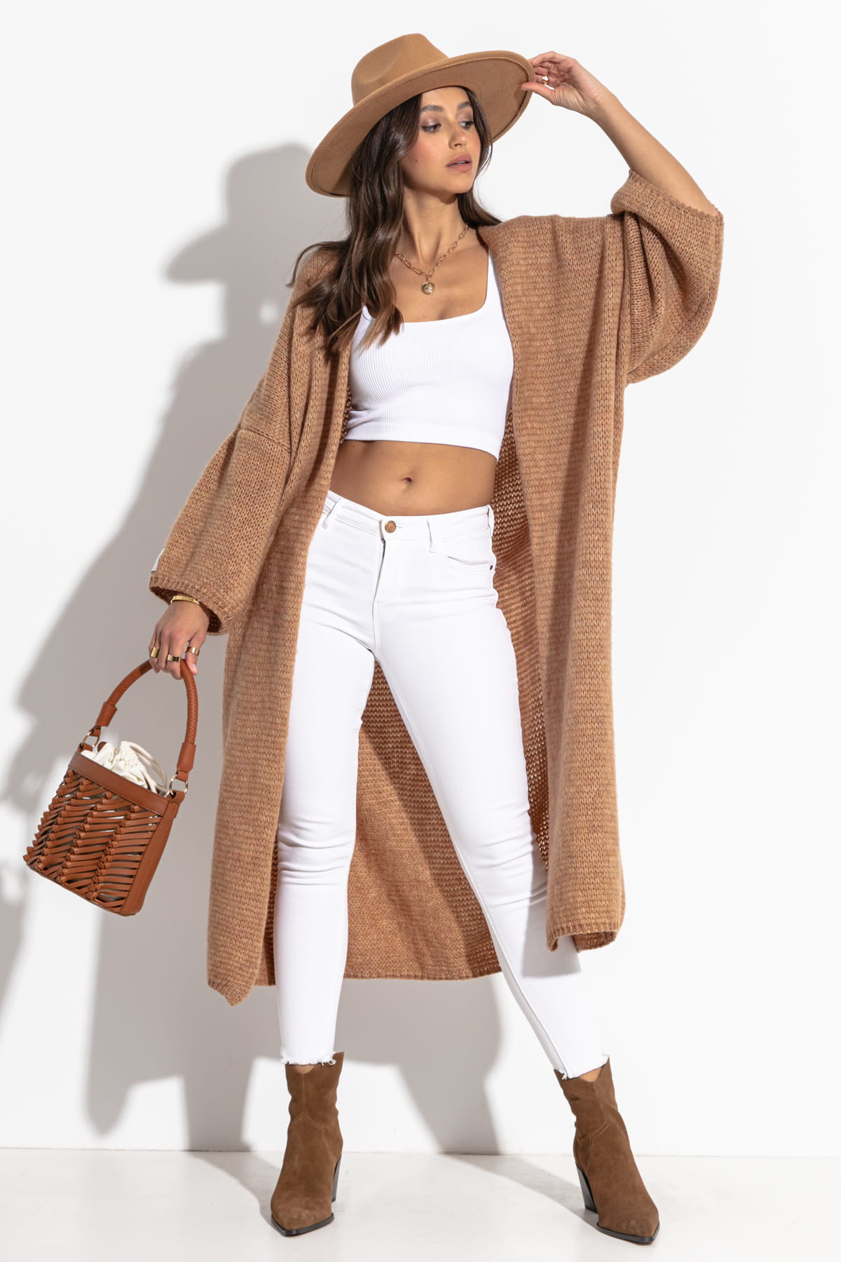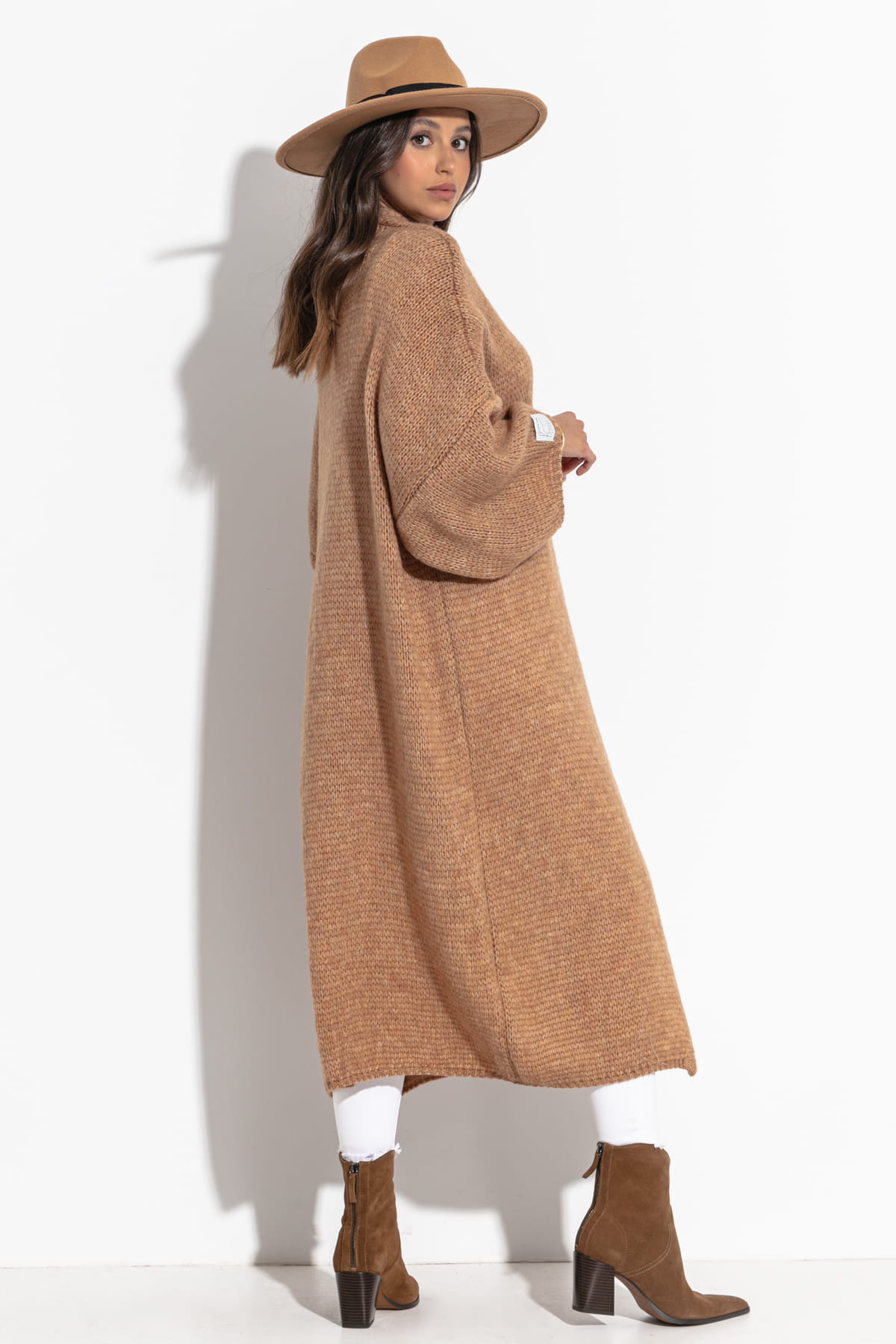 Długi kardigan oversize z szerokimi rękawami – idealny na chłodniejsze wieczory F1271 karmelowy