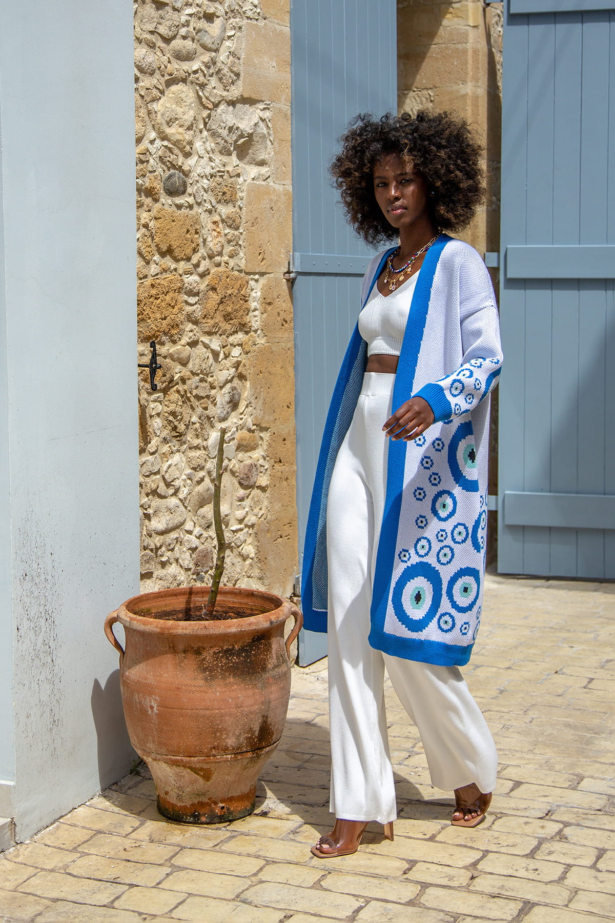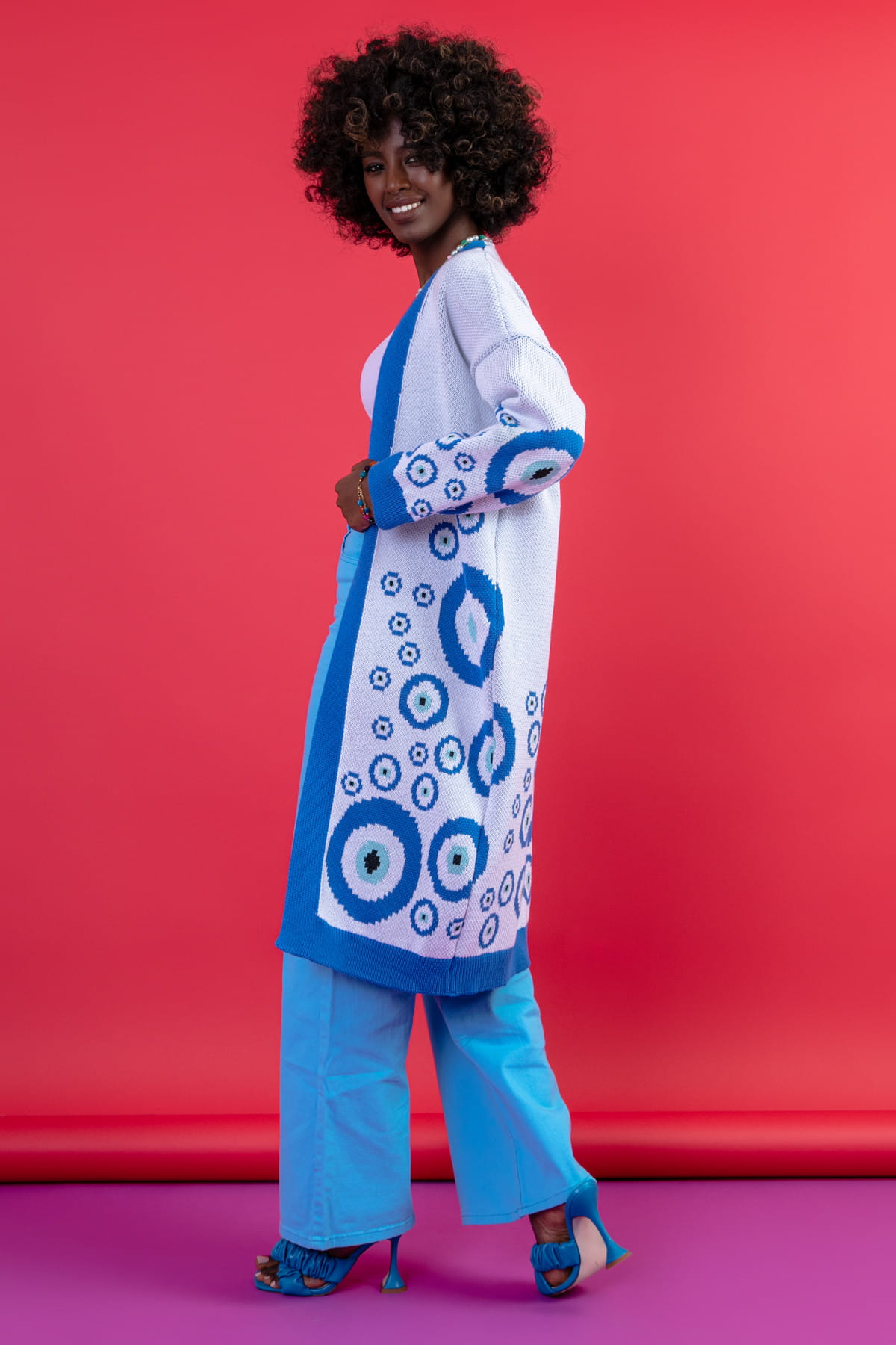 Długi kolorowy kardigan oko proroka F1649 niebieski