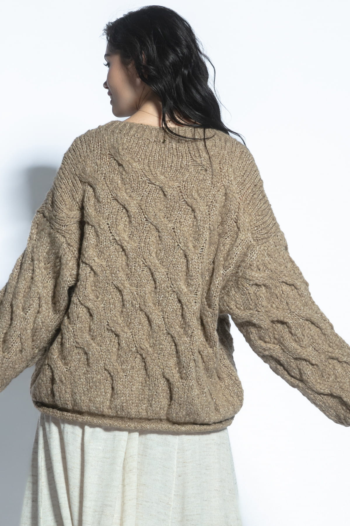 Obok tego pięknego swetra nie można przejść obojętnie. Wyróżnia się nie tylko fantastycznym designem, ale także wyjątkową jakością materiałów, z których został wykonany, mieszanki wełny alpaki i wełny dziewiczej. Jego ozdobny splot warkoczy nadaje mu niepowtarzalny charakter, a nieregularna struktura przędzy sprawia, że prezentuje się niezwykle interesująco i efektownie. Dzięki najwyższej jakości materiałom i unikalnemu wzornictwu, sweter ten z pewnością przyciągnie uwagę i doda elegancji każdej stylizacji.