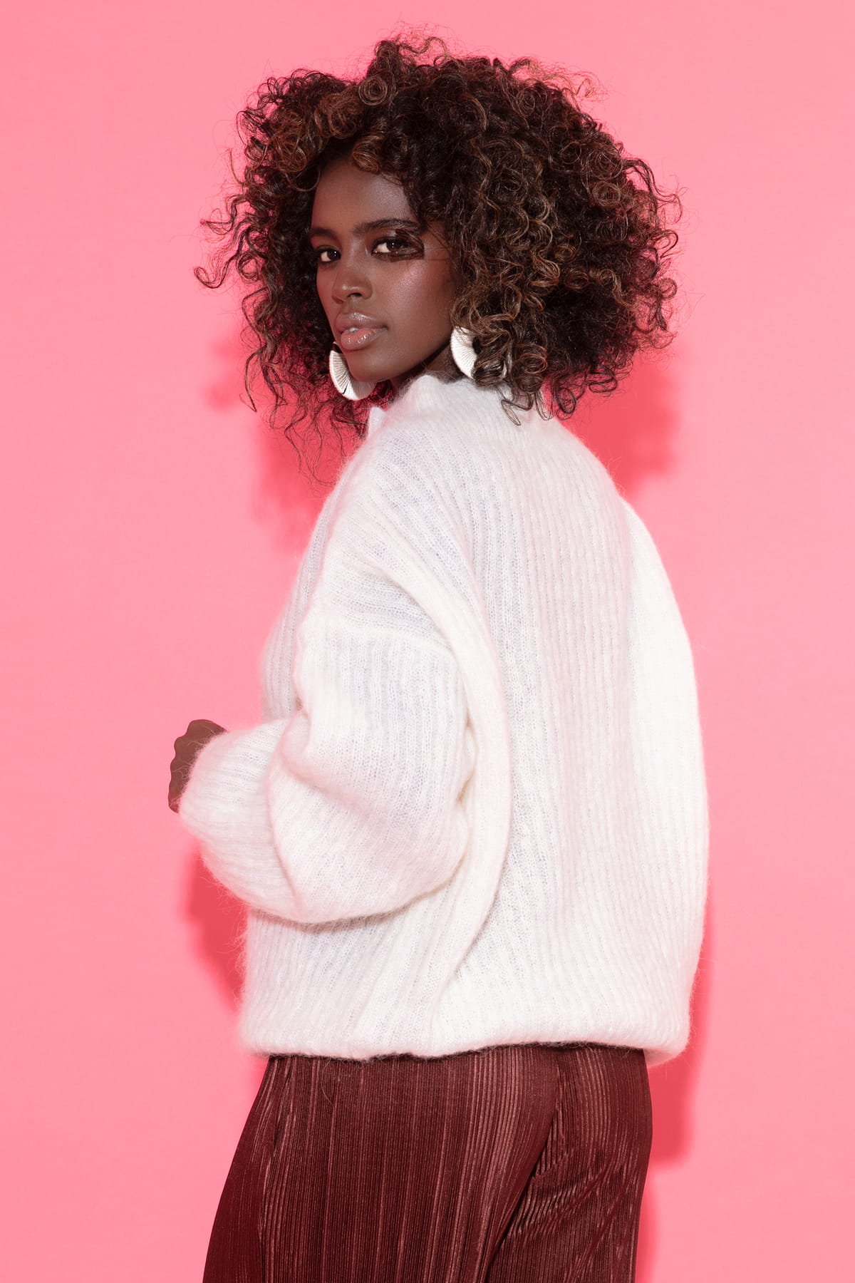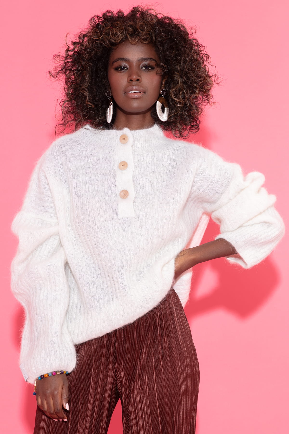 Sweter o klasycznym fasonie z wyjątkowym dekoltem - zapięty jest półgolfem, a rozpięty tworzy rozłożony kołnierz. Udziany z wysokogatunkowej przędzy cechującej się niewiarygodną miękkością i trwałością. Wełna alpaki, z której został udziany nie jest barwiona - to naturalne kolory futra alpak. Jeśli cenisz naturalność to ten sweter zdecydowanie jest dla Ciebie. Świetnie wygląda z szerokimi spodniami z wysokim stanem.