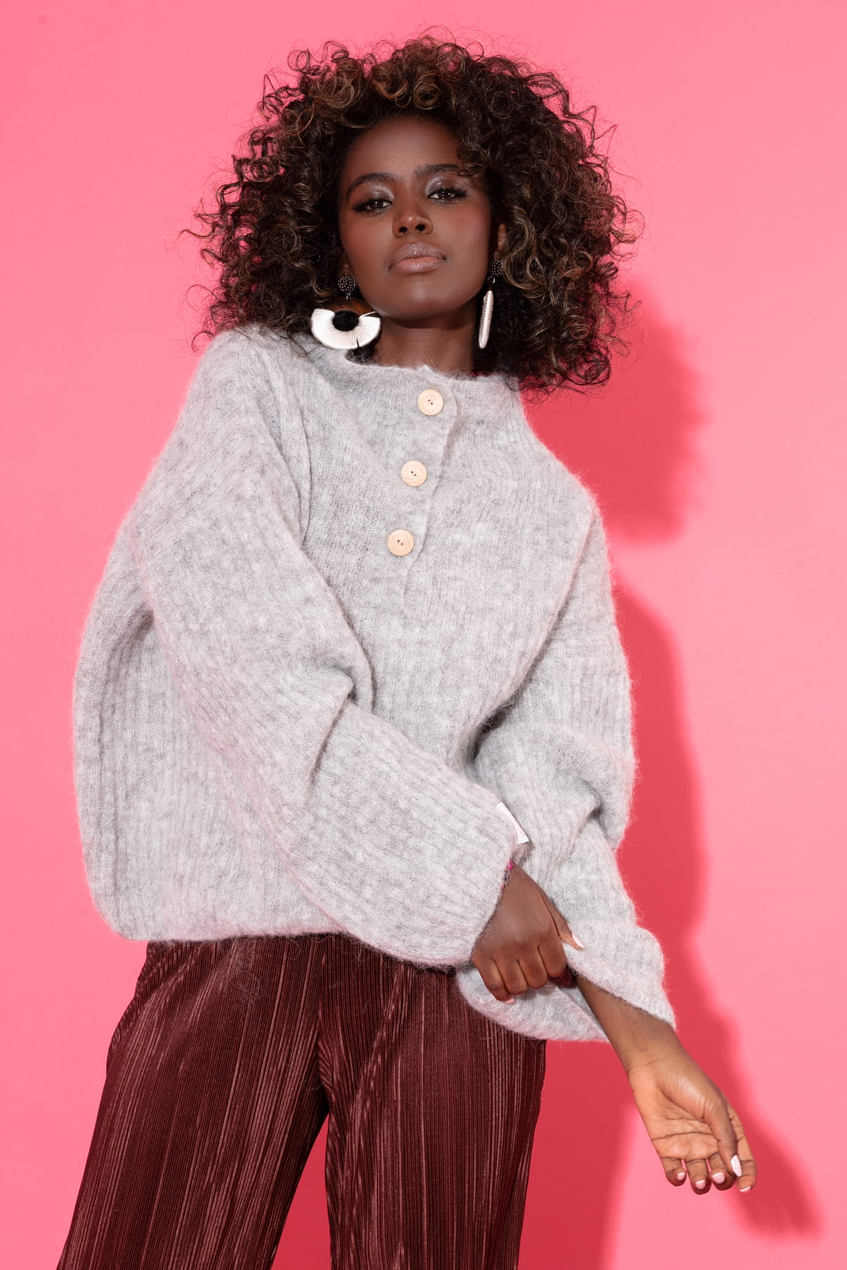 Sweter o klasycznym fasonie z wyjątkowym dekoltem - zapięty jest półgolfem, a rozpięty tworzy rozłożony kołnierz. Udziany z wysokogatunkowej przędzy cechującej się niewiarygodną miękkością i trwałością. Wełna alpaki, z której został udziany nie jest barwiona - to naturalne kolory futra alpak. Jeśli cenisz naturalność to ten sweter zdecydowanie jest dla Ciebie. Świetnie wygląda z szerokimi spodniami z wysokim stanem.