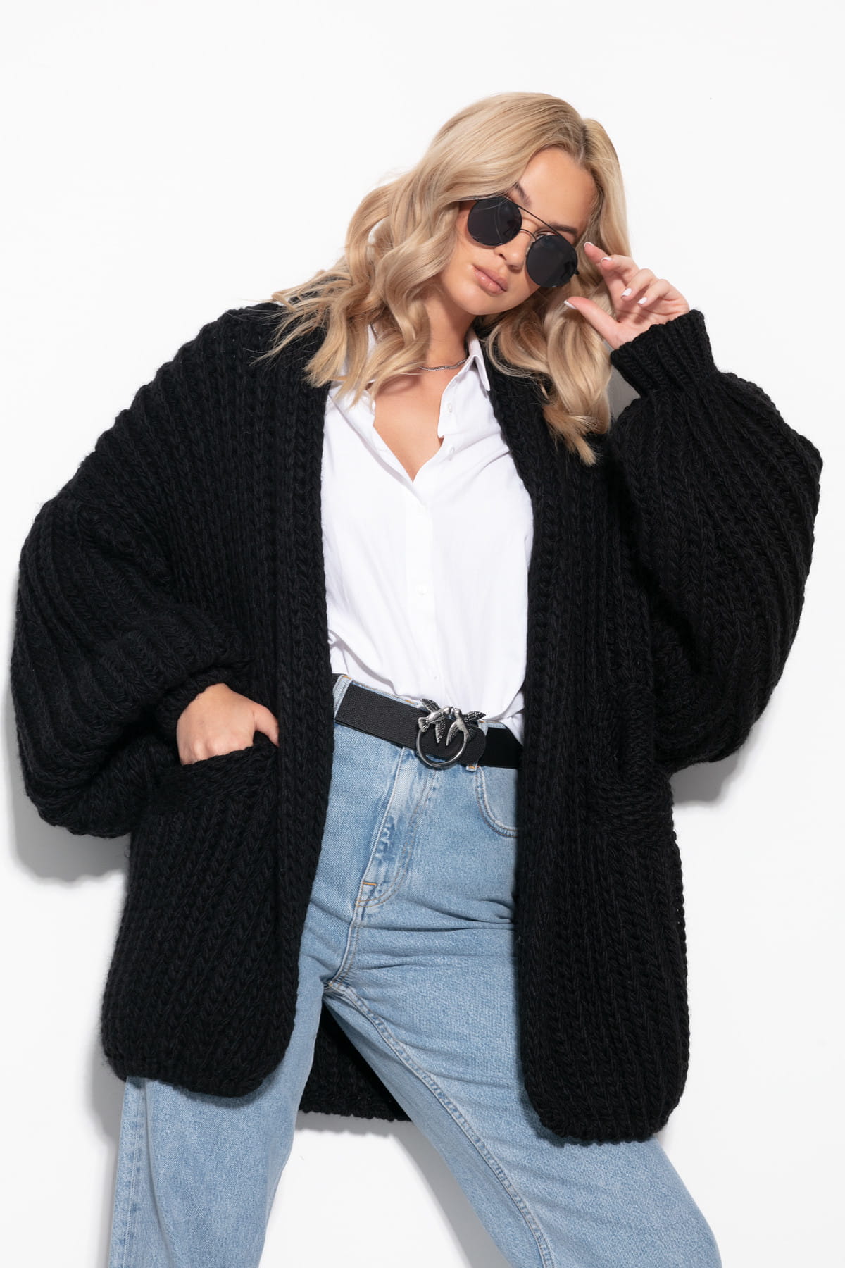 Kardigan oversize z kieszeniami grupy splot wełna alpaki F1090 czarny