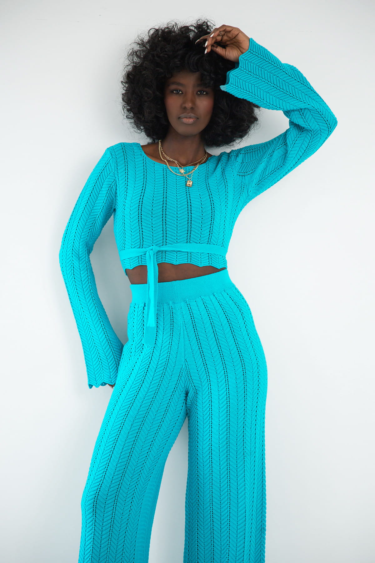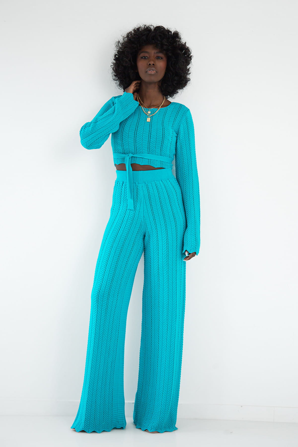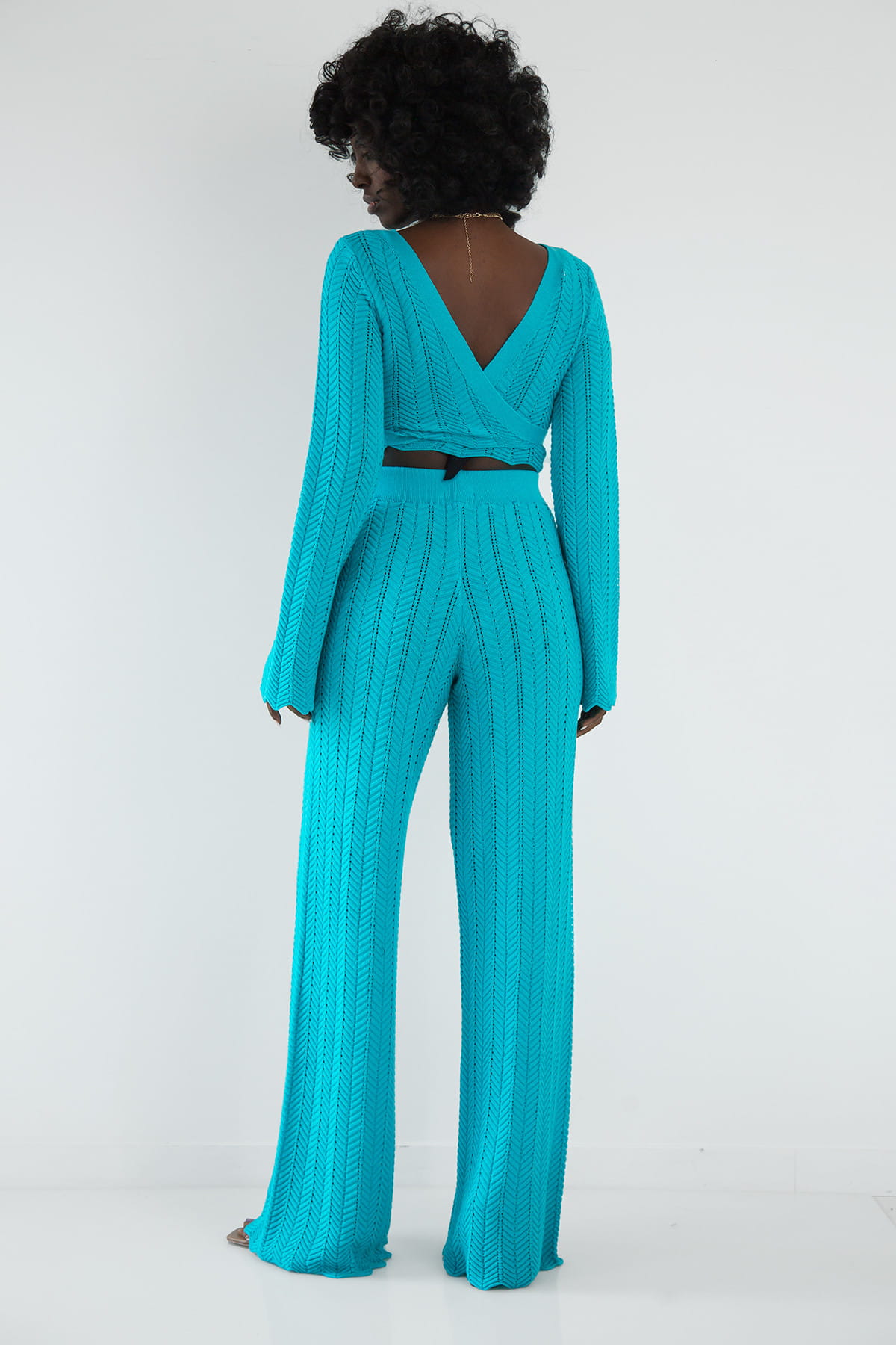 Stylowy ażurowy komplet składającemu się z długich spodni i krótkiej kopertowej wiązanej bluzki. To doskonały wybór na każdą letnią okazję, must-have w Twojej wakacyjnej garderobie. Połączenie elegancji, komfortu i funkcjonalności sprawia, że będziesz czuć się stylowo i swobodnie gdziekolwiek jesteś. Zainwestuj w jakość i styl, który zawsze robi wrażenie. Komplet będzie pasował zarówno na spacer po plaży, jak i wieczorne wyjście. Wykonany z delikatnej, bawełnianej ażurowej dzianiny zapewnia komfort i lekkość.