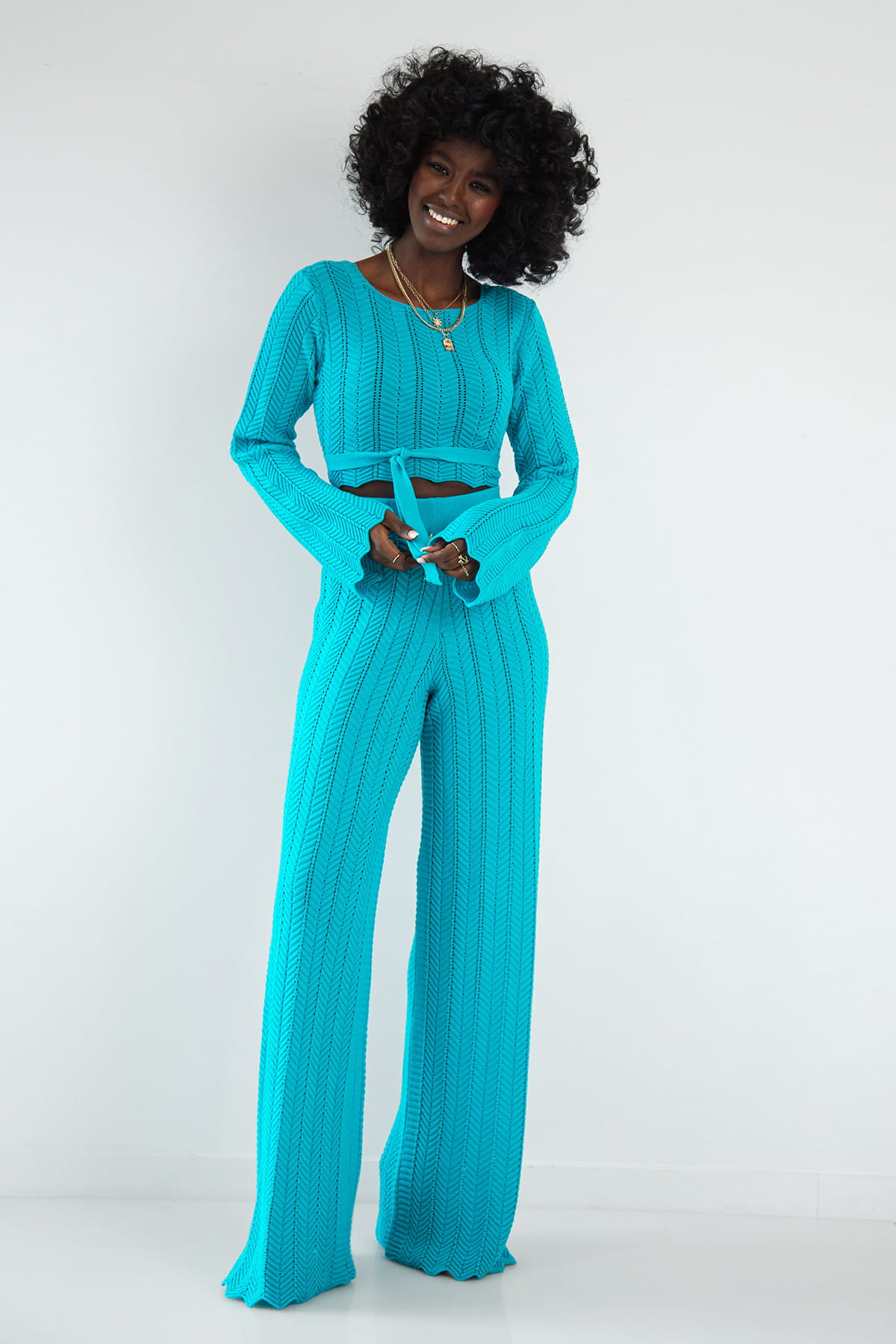 Komplet długie spodnie ażurowe i bluzka wiązana F1862 niebieski