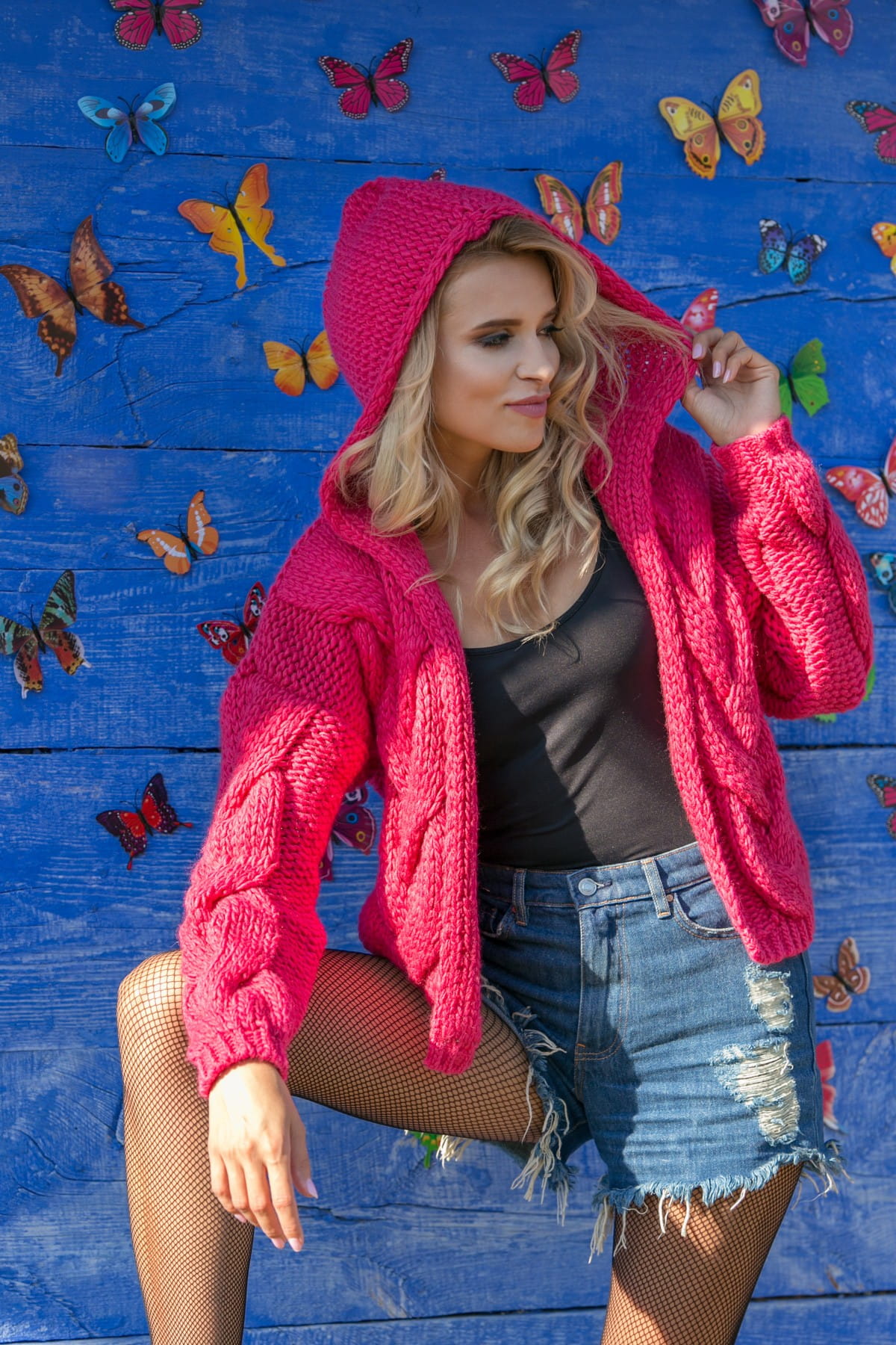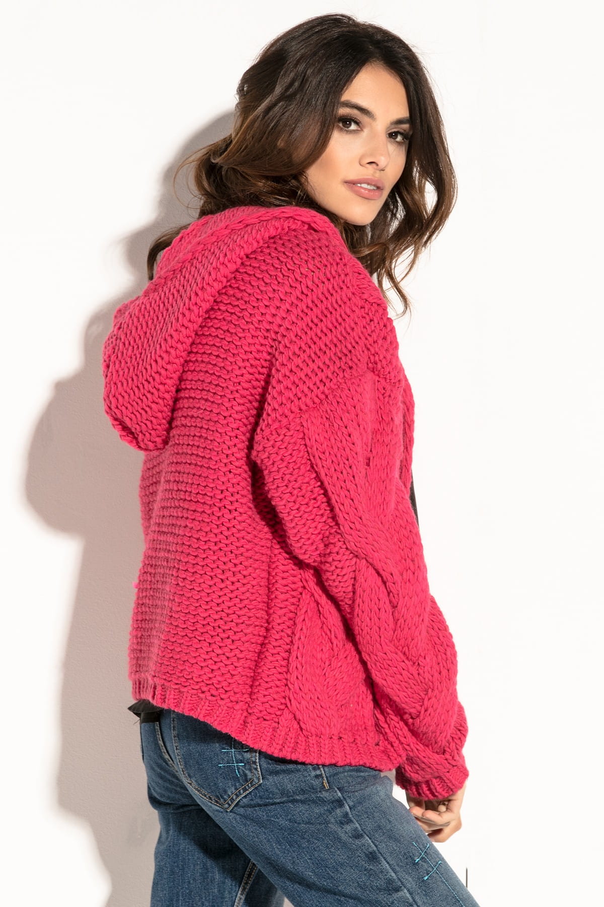 Krótki kardigan z kapturem bomberka – wełna i alpaka F580 różowy