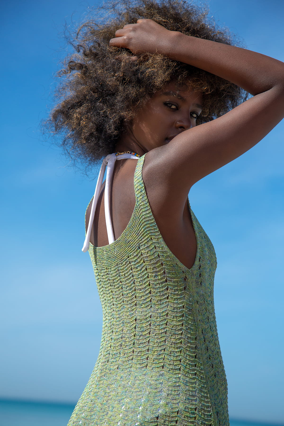 Delikatna jak mgiełka, przewiewna plażowa sukienka wykonana z melanżowej przędzy, idealna jako narzutka na kostium kąpielowy.  Wykonana z recyklingowego surowca, z dużą ilością bawełny w składzie. Sukienka lekko połyskuje dzięki dodatkowi metalicznej nitki. Po bokach rozporki.