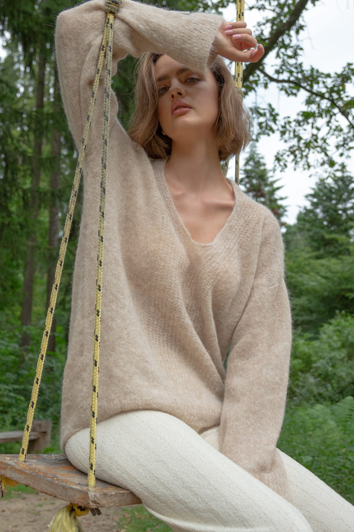 Sweter z wełny alpaki z dekoltem F1395 beżowy