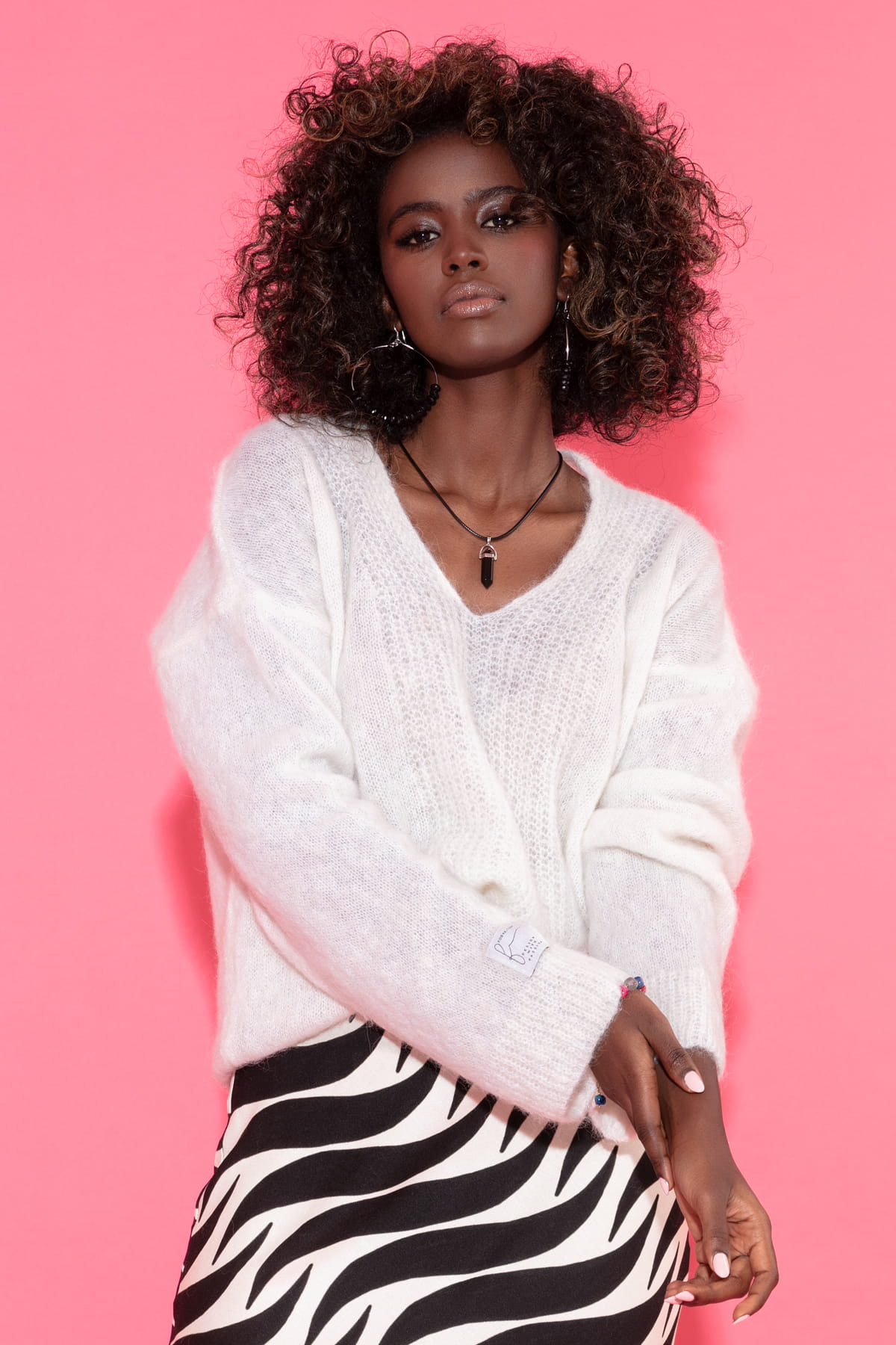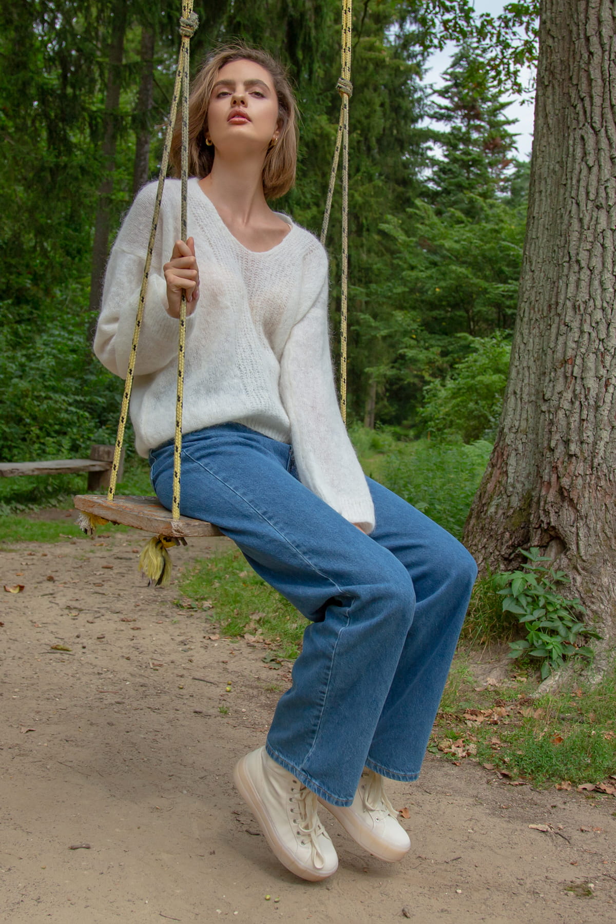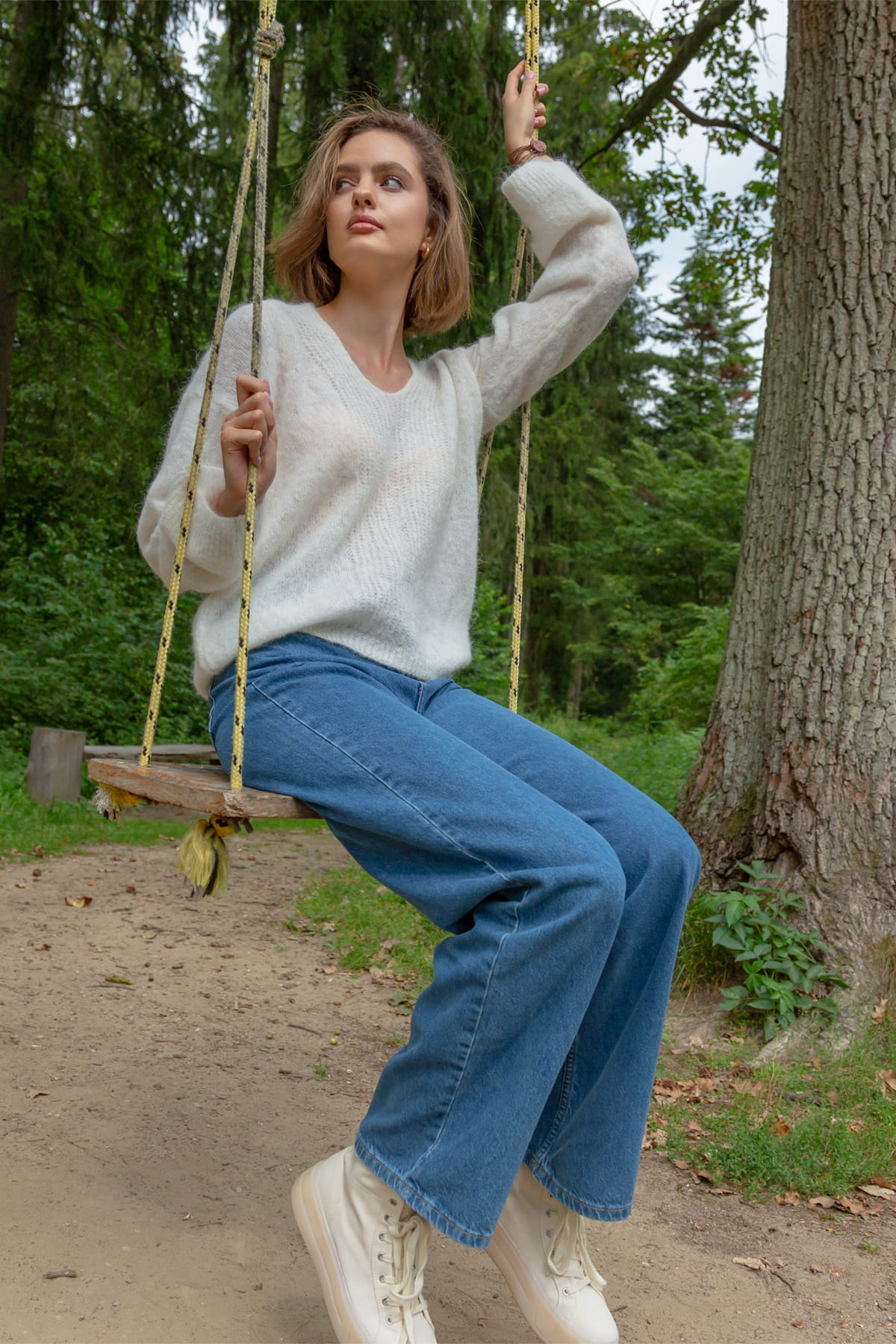 Klasyczny, elegancki sweterek z dekoltem w serek z doskonałej jakość wełny alpaki, wyjątkowo miękki, z dłuższym włosem, będzie towarzyszył Ci przez wiele sezonów. Wełna z jakiej udziany jest sweter to naturalne kolory futra alpak - nie jest barwiona żadnymi barwnikami.