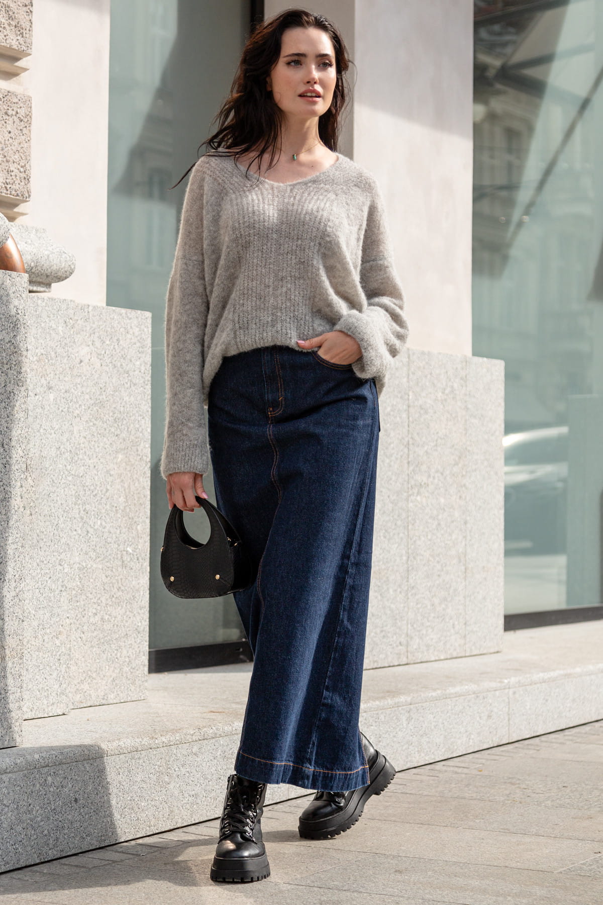Sweter z wełny alpaki z dekoltem F1395 szary
