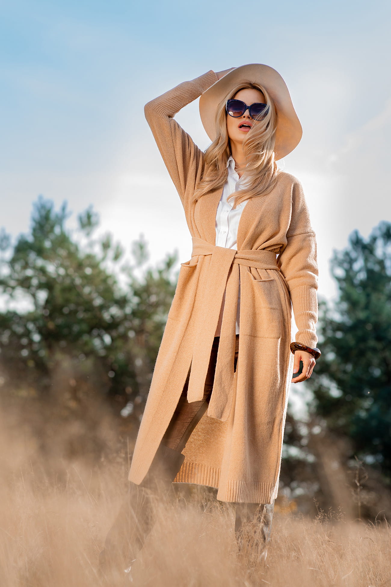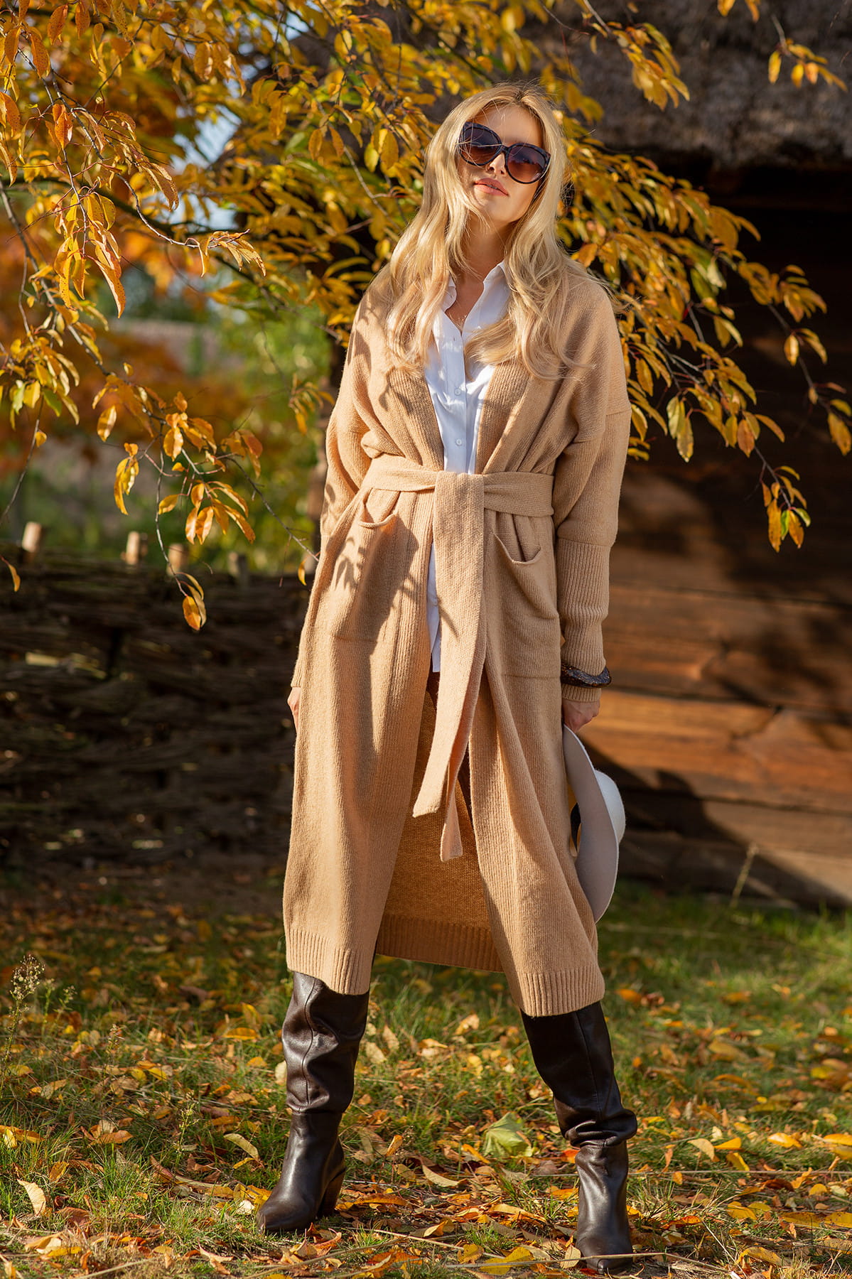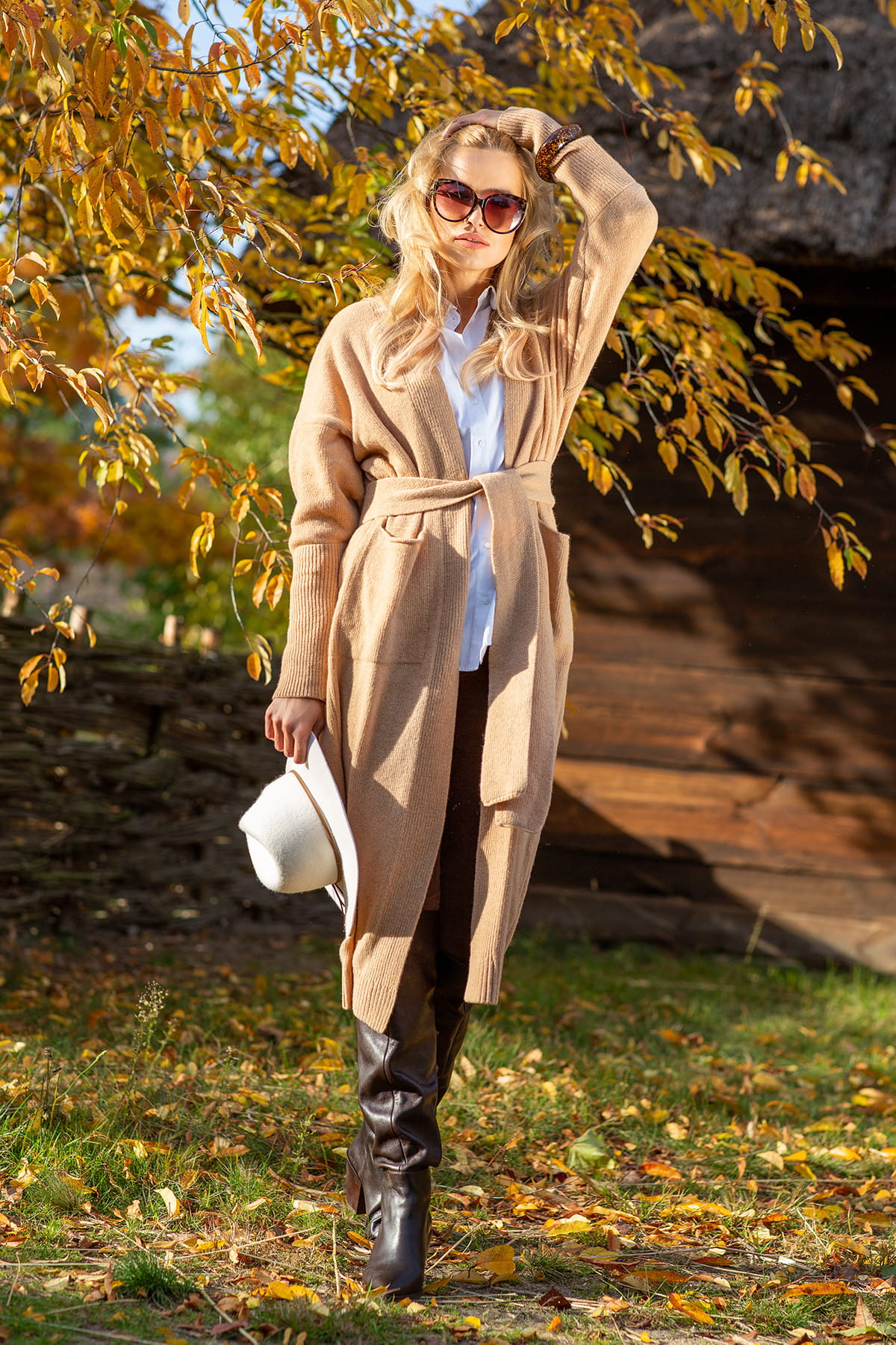 Wełniany długi kardigan z paskiem F1116 karmelowy