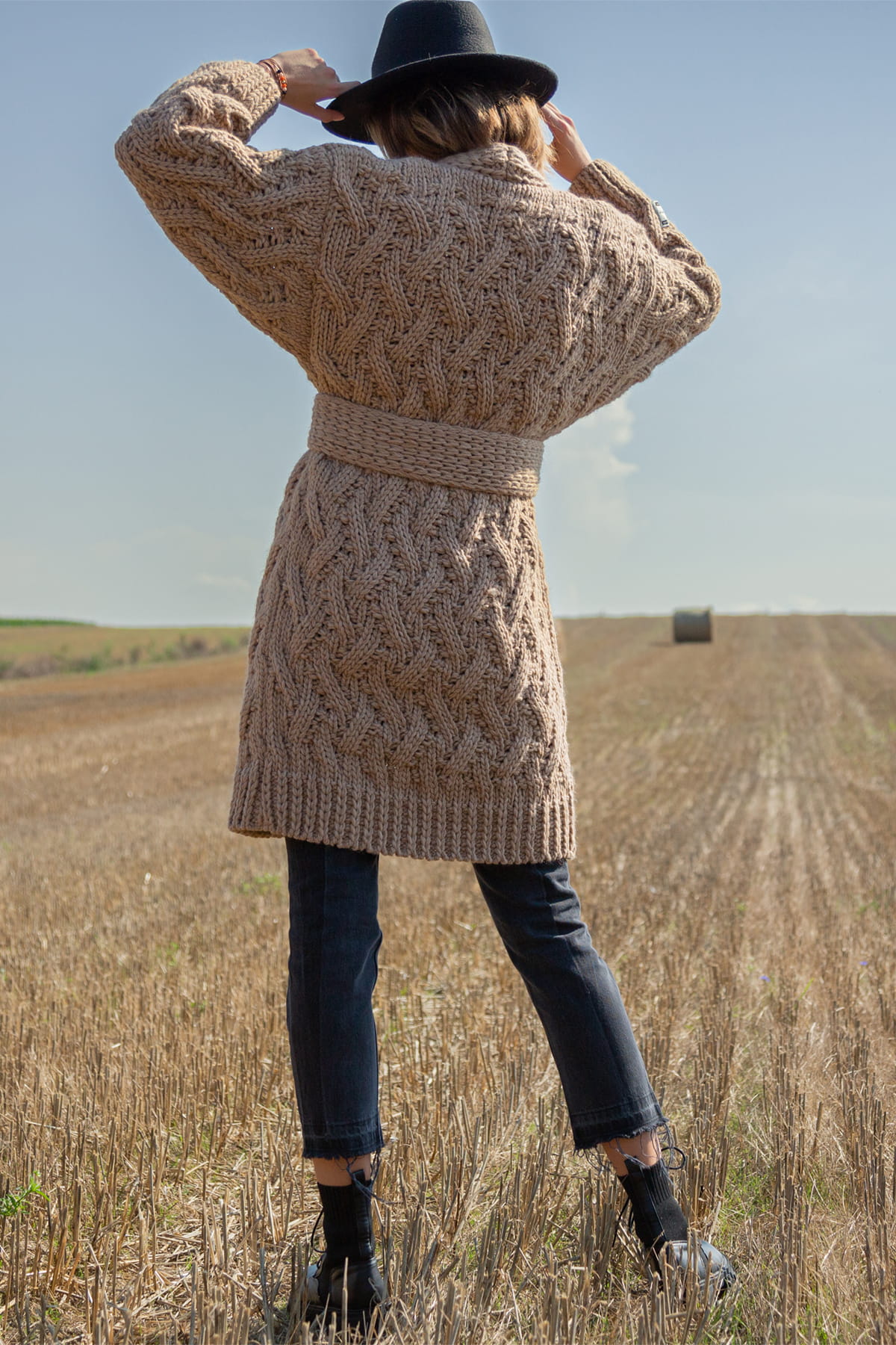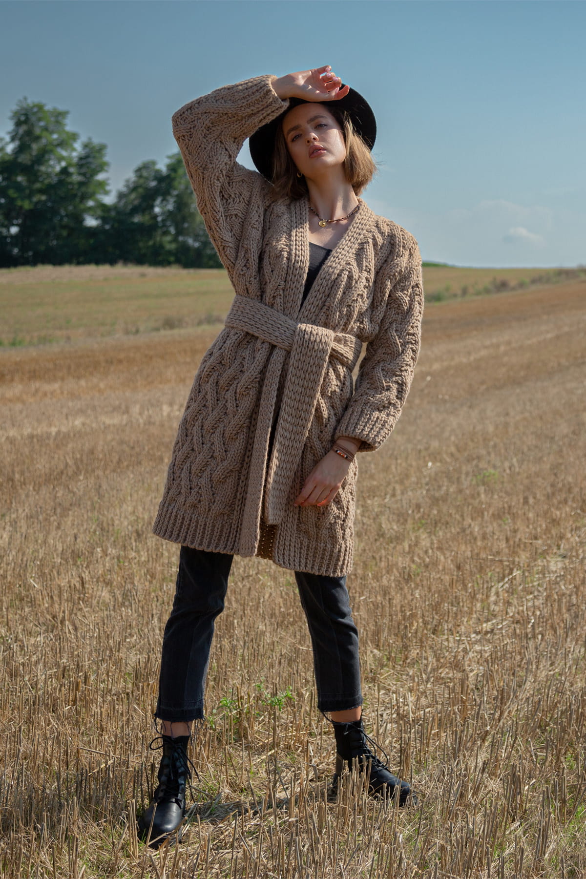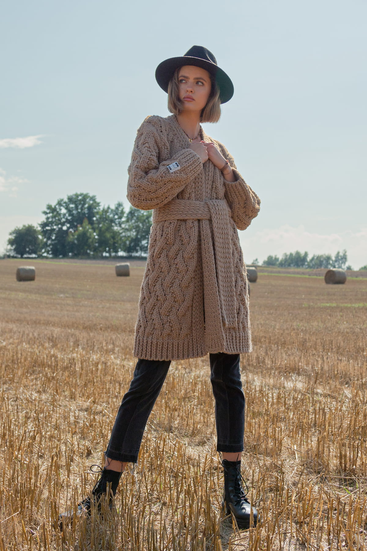 Swetry i kardigany z kolekcji Chunky Knit cechują grube sploty i ciepłe przędze, to nasz ukłon w stronę produktów hand made. Jeśli szukasz swetra na lata - to kolekcja Chunky Knit jest dla Ciebie! Ten kardigan to nieco mniej obszerna wersja Chunky, ale nadal zachowuje swoje wypukłe warkocze i gruby slot. Długość do kolan dla wzrostu 175-180, a delikatnie za kolano dla niższych kobiet. Związany paskiem doskonale podkreśla talię. Jesienią nie noś kurtki, ale wełniany stylowy kardigan!
