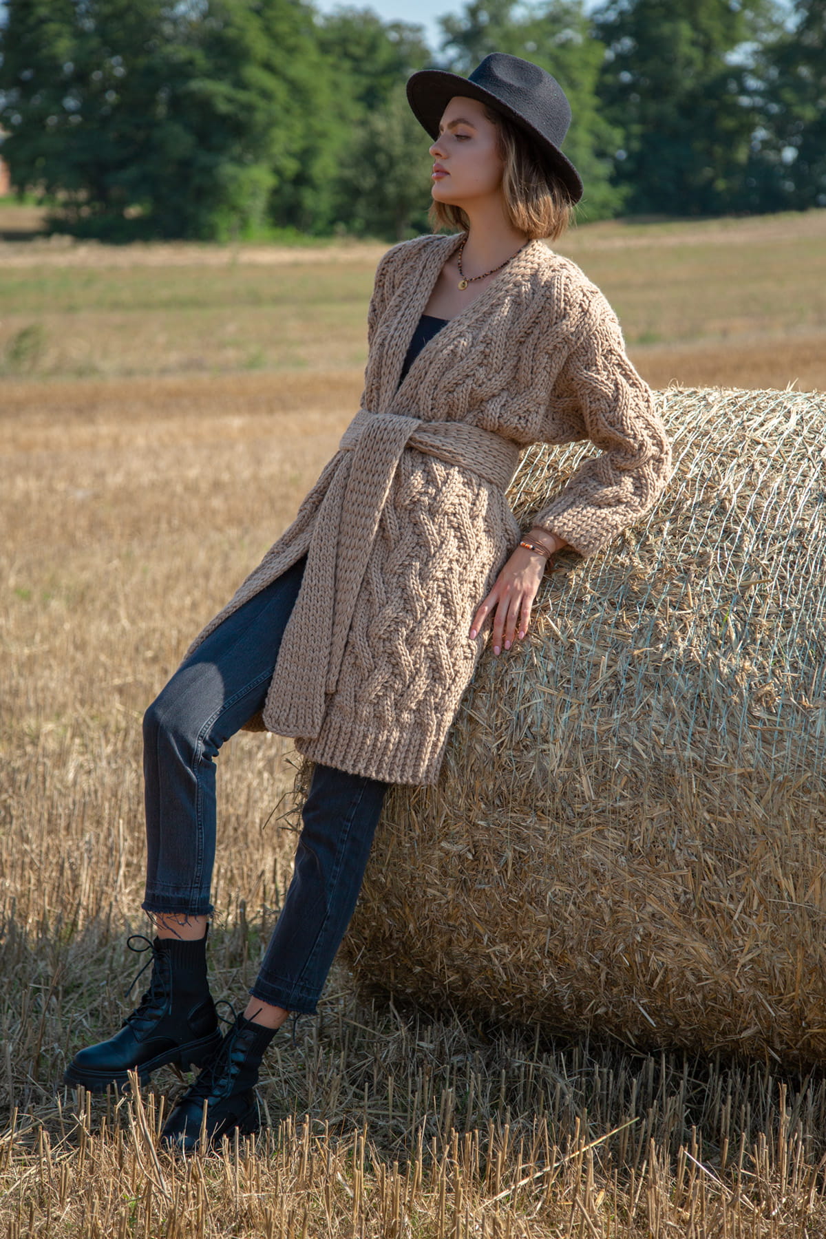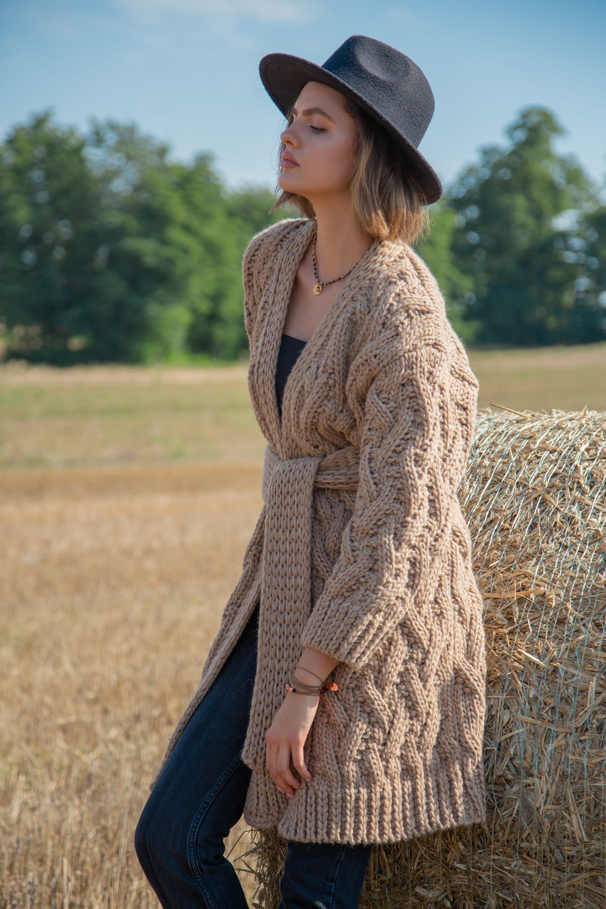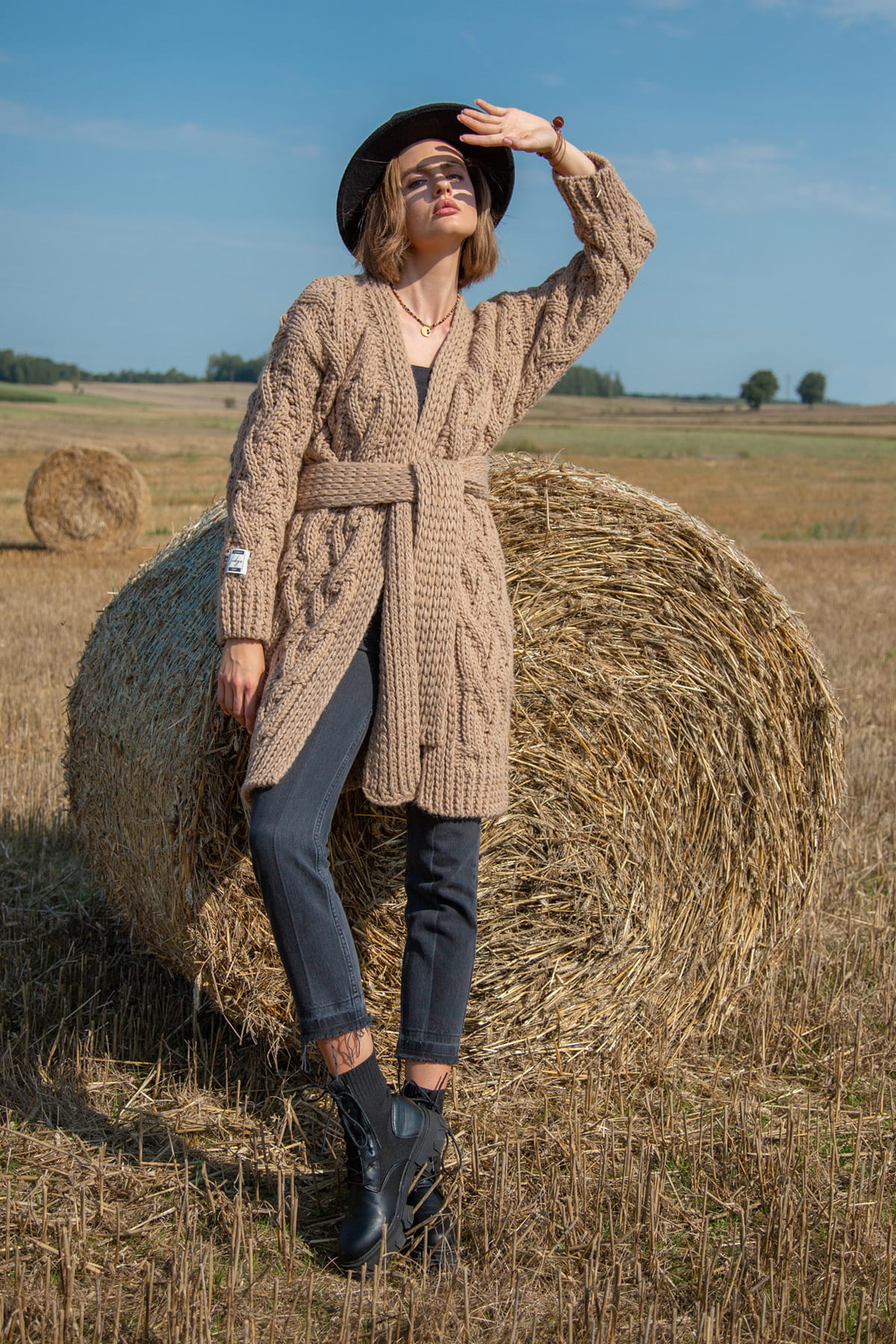Swetry i kardigany z kolekcji Chunky Knit cechują grube sploty i ciepłe przędze, to nasz ukłon w stronę produktów hand made. Jeśli szukasz swetra na lata - to kolekcja Chunky Knit jest dla Ciebie! Ten kardigan to nieco mniej obszerna wersja Chunky, ale nadal zachowuje swoje wypukłe warkocze i gruby slot. Długość do kolan dla wzrostu 175-180, a delikatnie za kolano dla niższych kobiet. Związany paskiem doskonale podkreśla talię. Jesienią nie noś kurtki, ale wełniany stylowy kardigan!