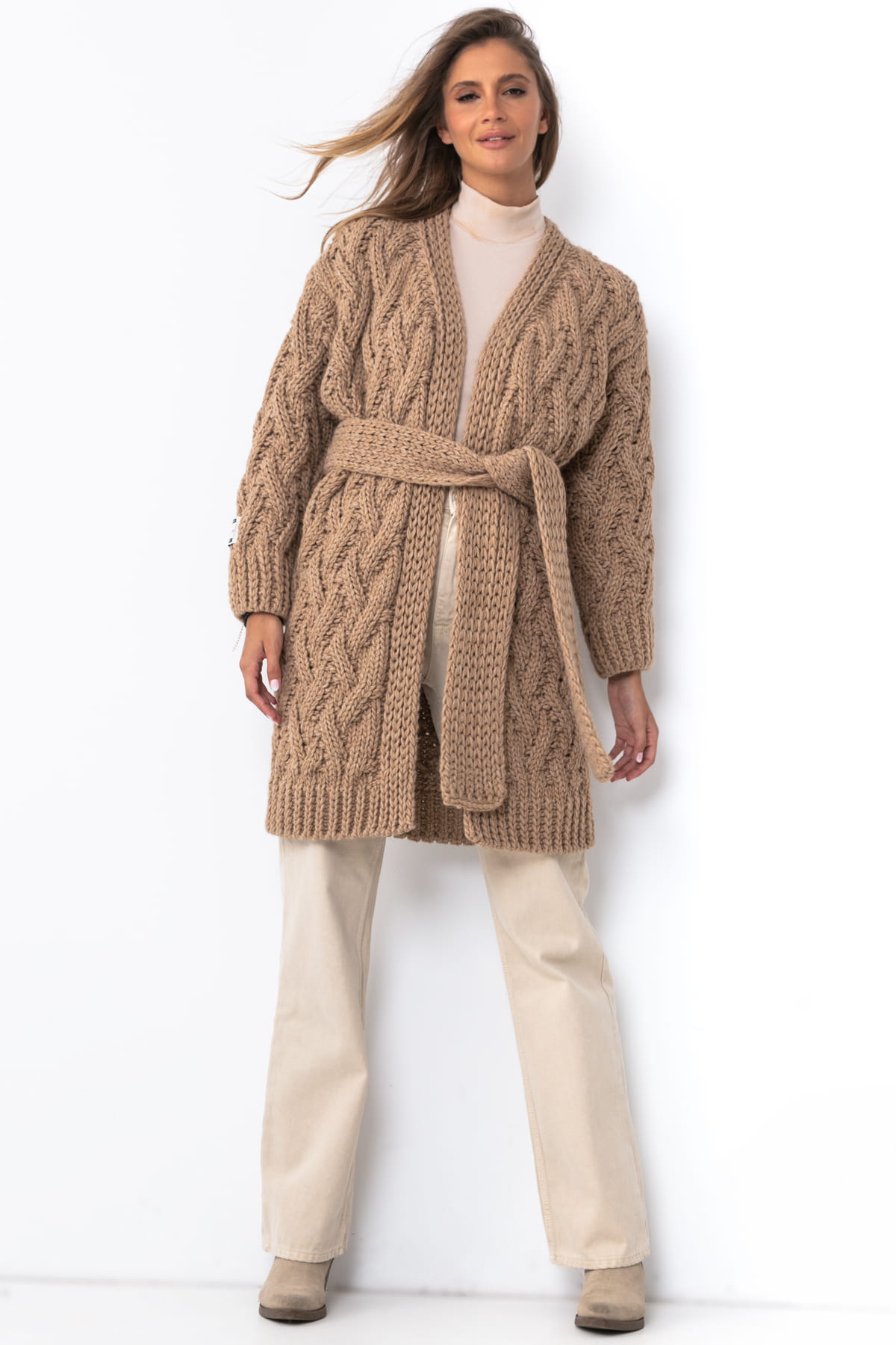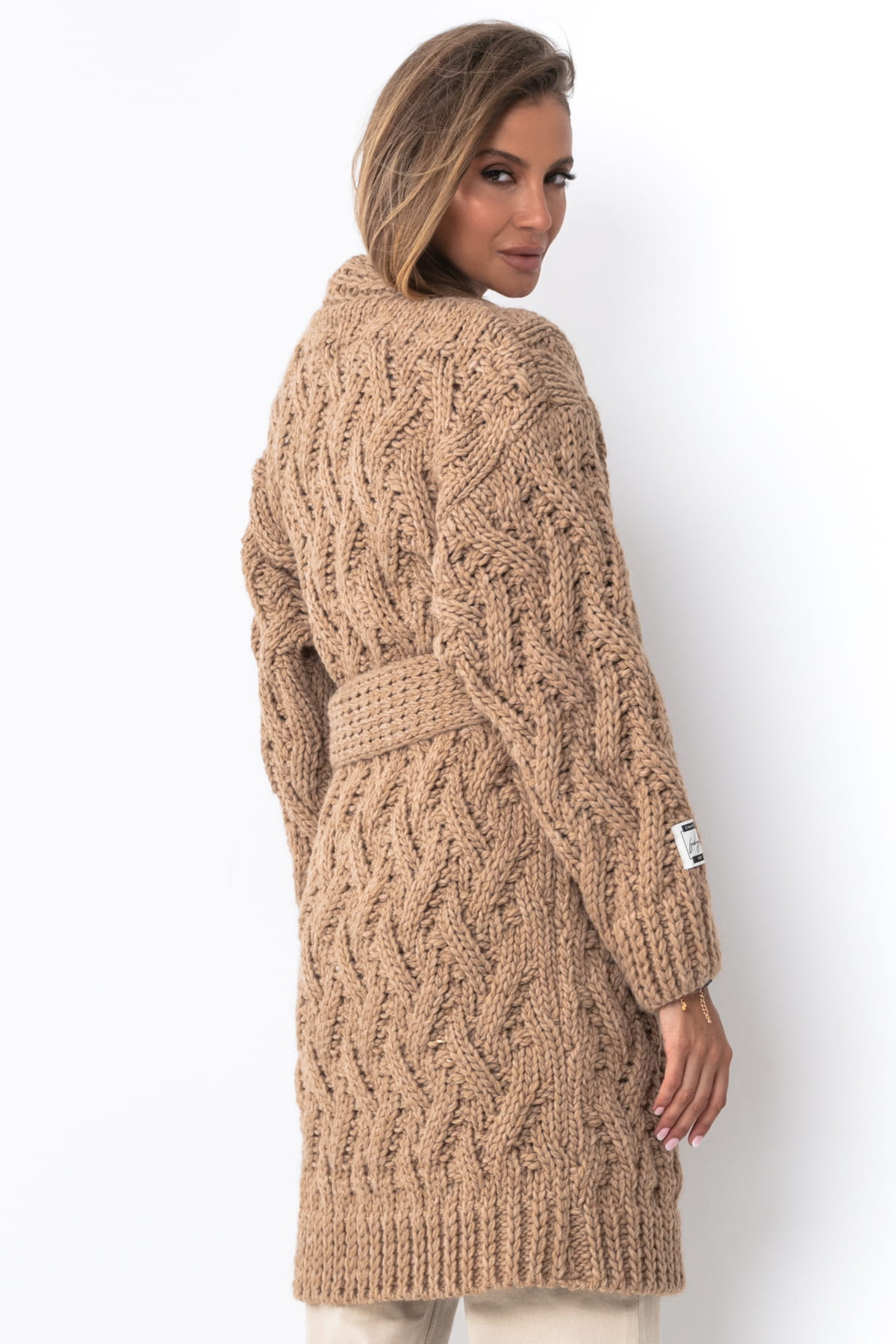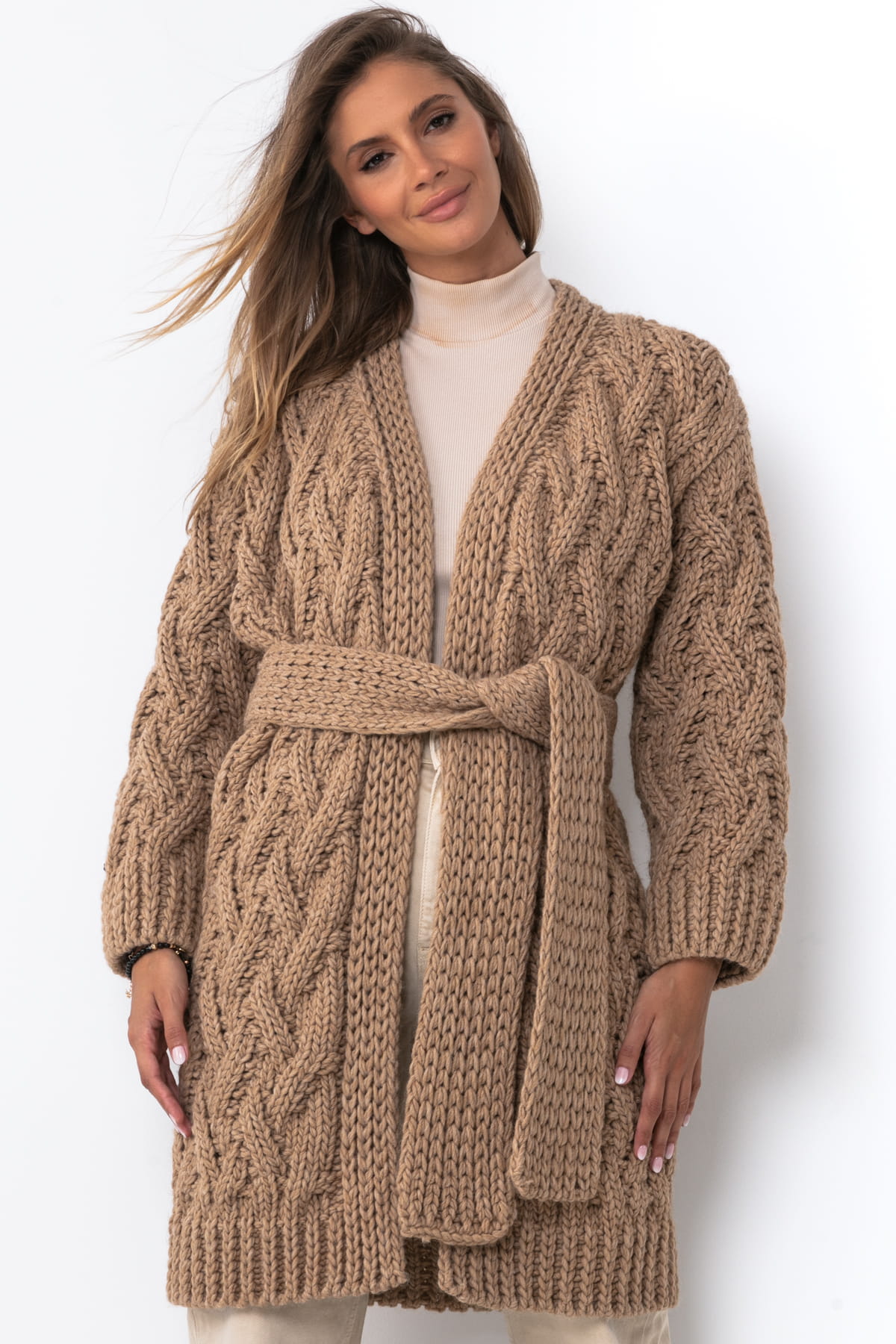 Wełniany kardigan o grubym splocie z paskiem F1480 karmelowy