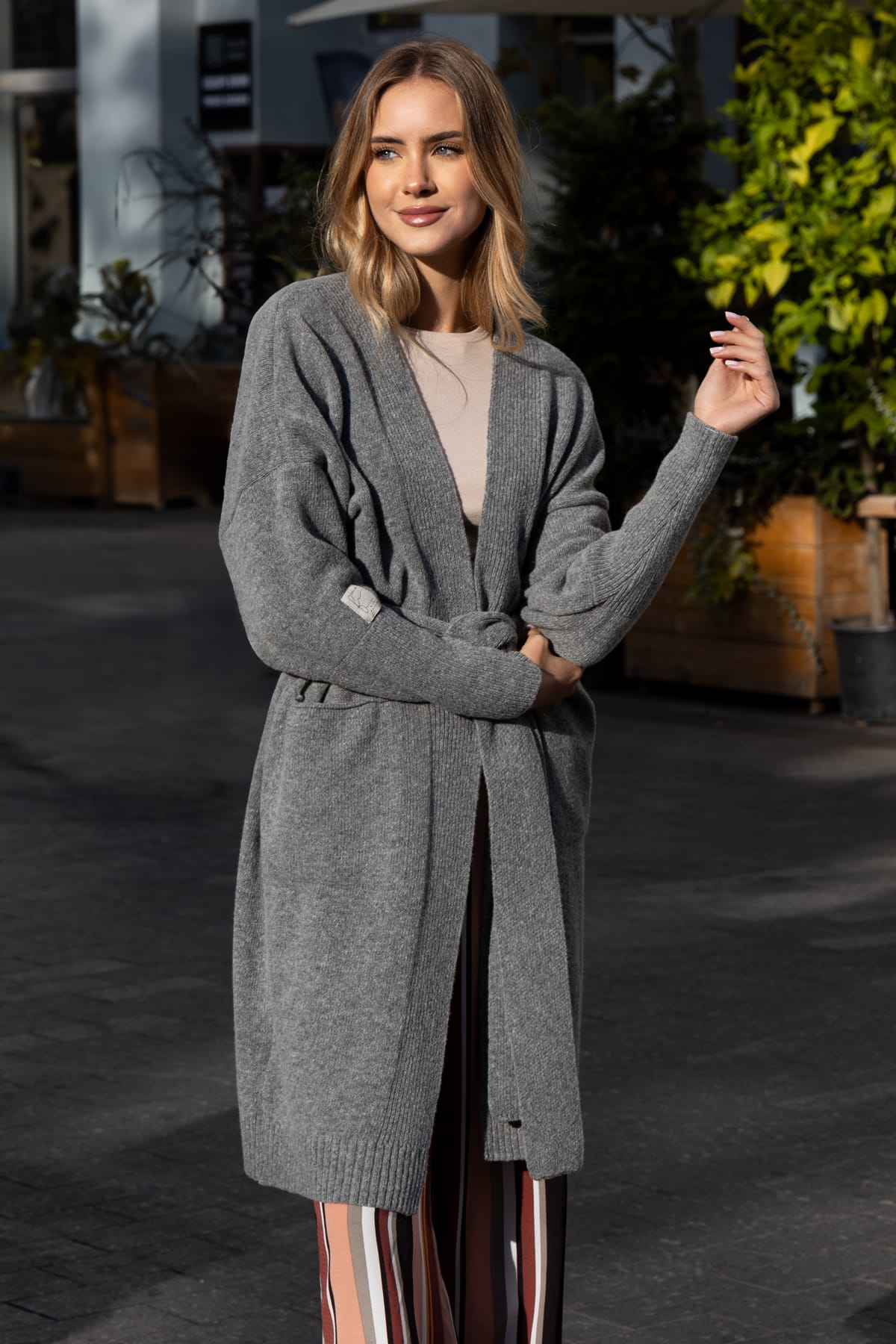 Otwarty przód daje swobodę i lekkość. Kardigan możesz nosić według własnych preferencji w dwóch wersjach, puszczony luźno lub podkreślając figurę, przewiązany w talii paskiem.  Klasyczny szary kolor dodaje klasy i elegancji. Kardigan świetnie sprawdzi się jako warstwa wierzchnia na t-shirt lub bluzkę. Idealnie komponuje się zarówno z casualowymi, jak i bardziej formalnymi stylizacjami.